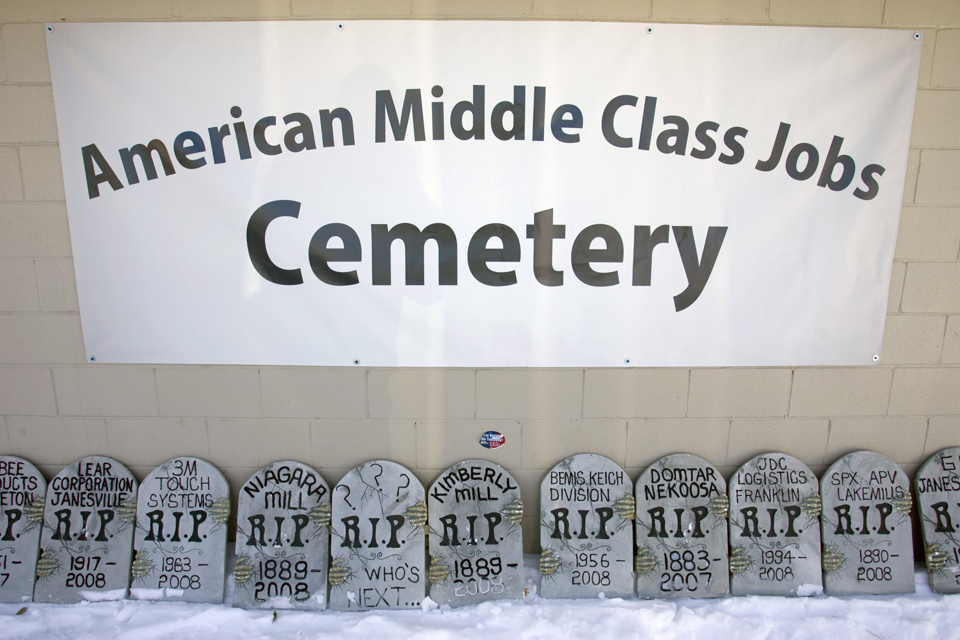 Grave stones that bear the names of local shuttered factories sit across the street from the closed NewPage paper mill in Kimberly, Wisconsin, on Dec. 11, 2008. (Matt Ludtke/Bloomberg via Getty Images)