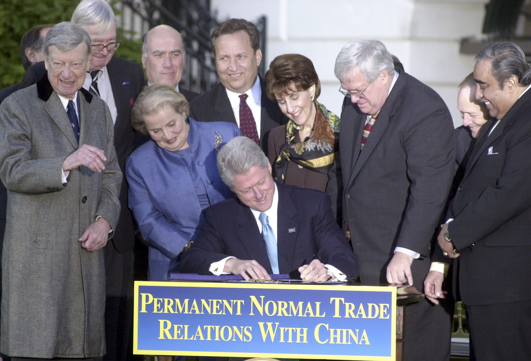 President Clinton, surrounded by Secretary of State Madeline, Treasury Secretary Larry Summers, Sen. William V. Roth (R-DE), and House Speaker J. Dennis Hastert (R-IL), signed a bill permanently normalizing trade relations with China on the south lawn of the White House 0n October 10, 2000. (Tom Williams/Roll Call/Getty Images)