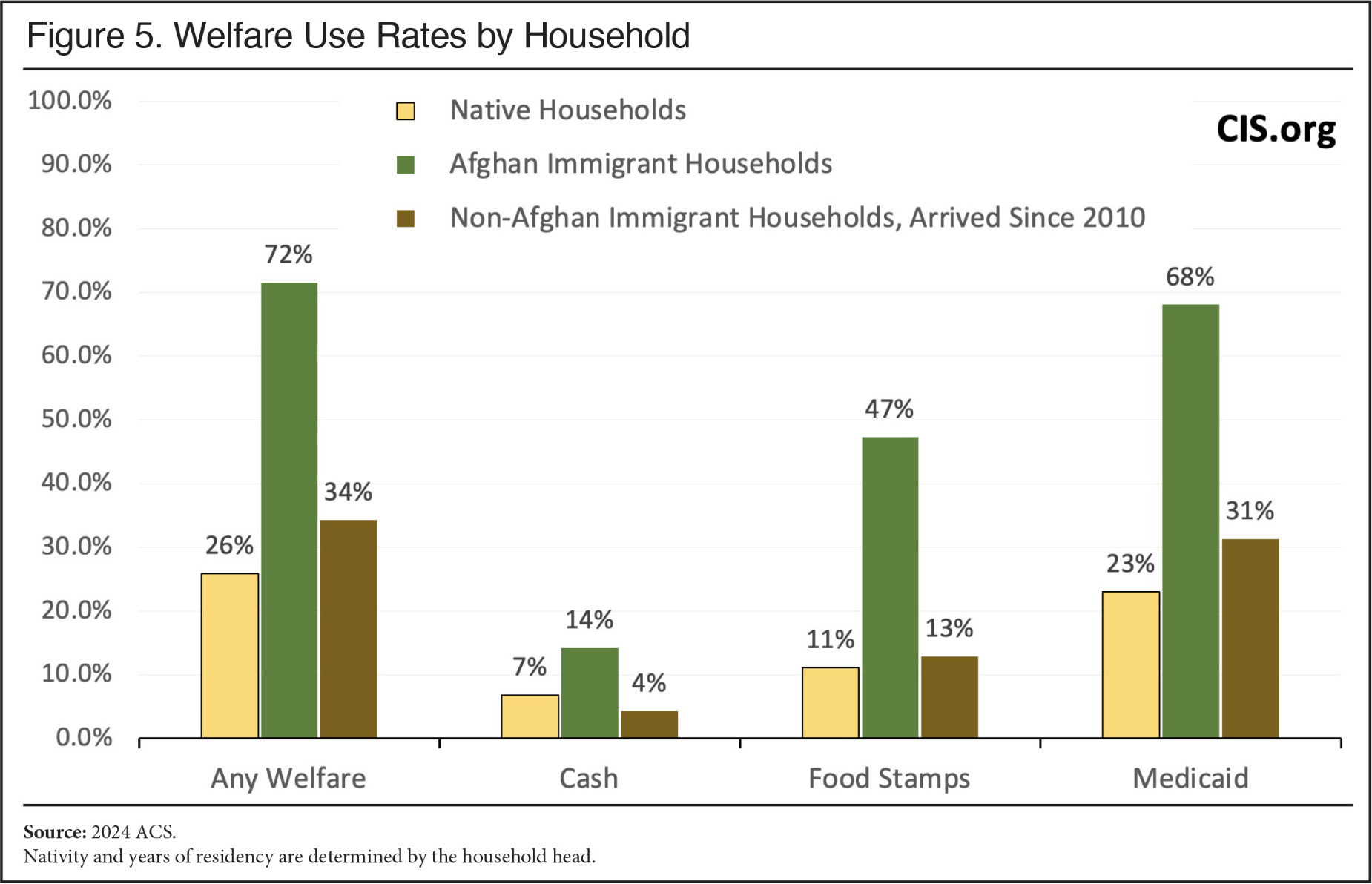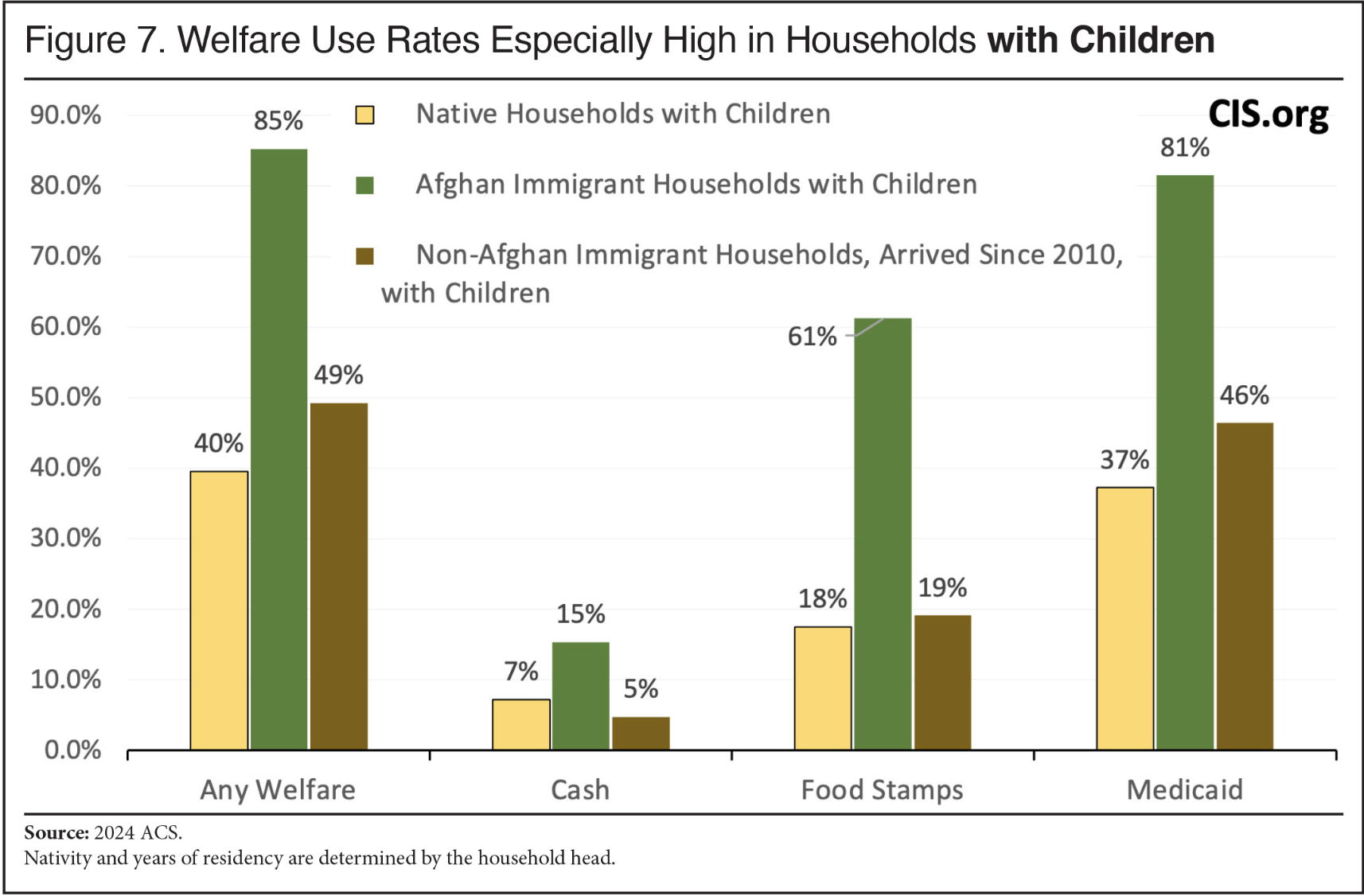 Compare this massive absorption of welfare by the Afghan immigrant population to native-born American households with children, 40 percent of which consume welfare, including 37 percent on Medicaid, 18 percent on food stamps, and just seven percent on cash assistance.