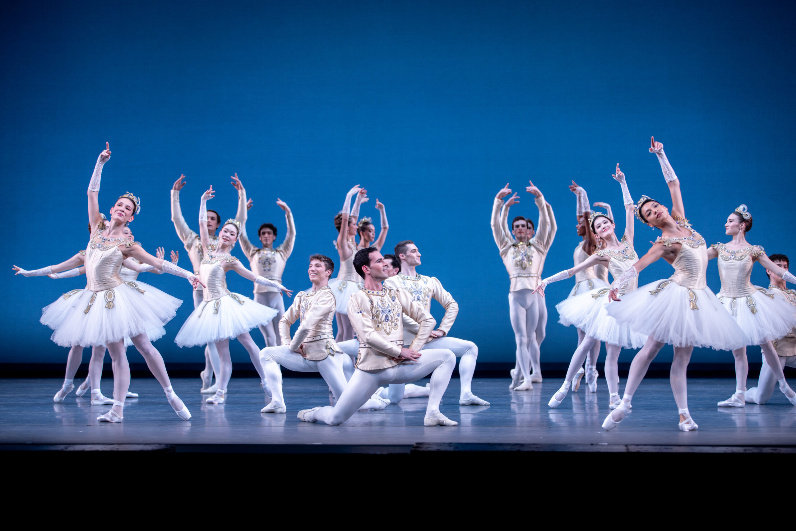 The evening opened with Diamonds, which demonstrated the technical prowess of the entire company. It is the finale of Balanchine’s three-act storyless ballet Jewels, a chef’s platter of standalone balletic techniques—united only by the designer Karinska’s jewel-inspired costumes. Diamonds nods to Balanchine’s roots in the Imperial Russian Ballet and is set to Tchaikovsky’s Symphony No. 3 in D Major, Op. 29.