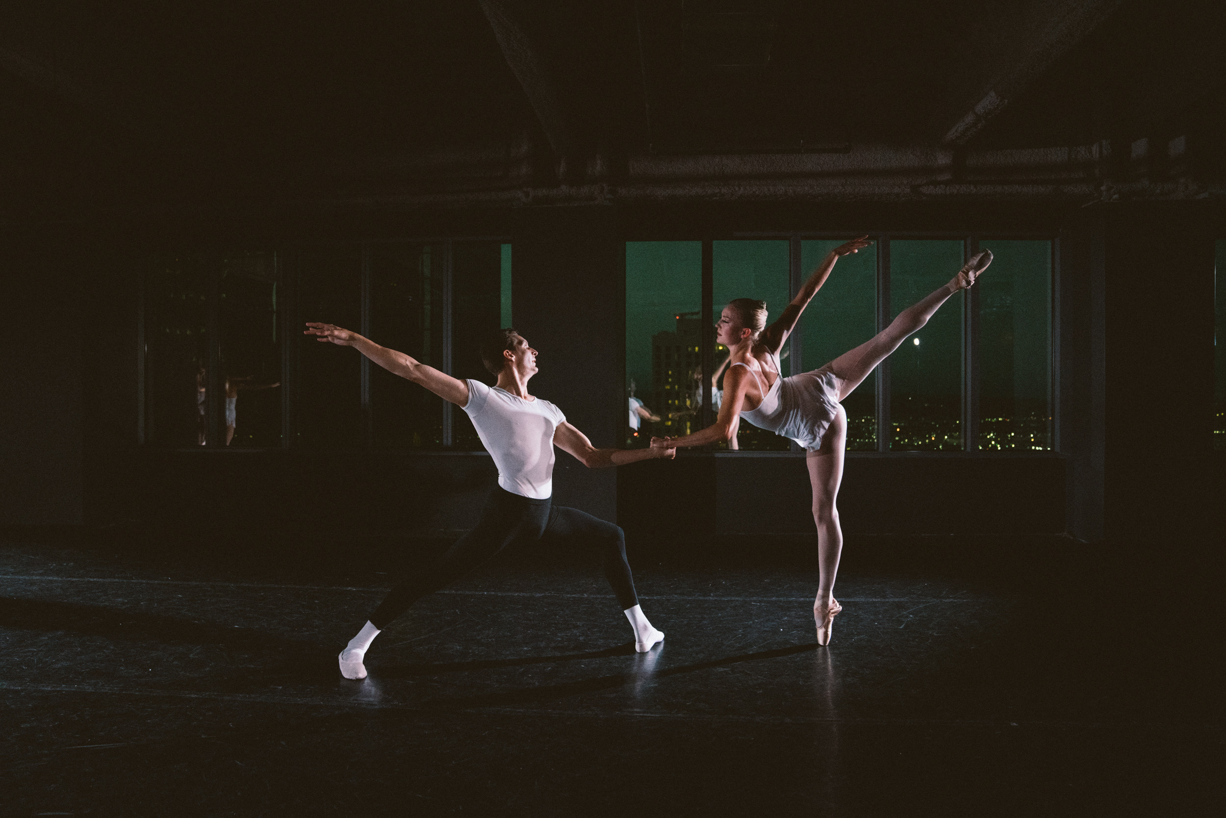 The ballet’s black-box style theater, actually a sleekly converted office space on the bottom floor of the Bank of America building in downtown Los Angeles, allows audiences to enjoy Balanchine in an elegant and freshly intimate way. Entering through the curtains, one finds a cocktail area on one side and a pianist playing mood music under a blue light on the other, separated by the black Marley dance floor, over which one has to walk to get to the seats. Draped curtains partition off the audience from the dancers preparing for performance “backstage.” It feels midway between a speakeasy and a cocktail soirée.