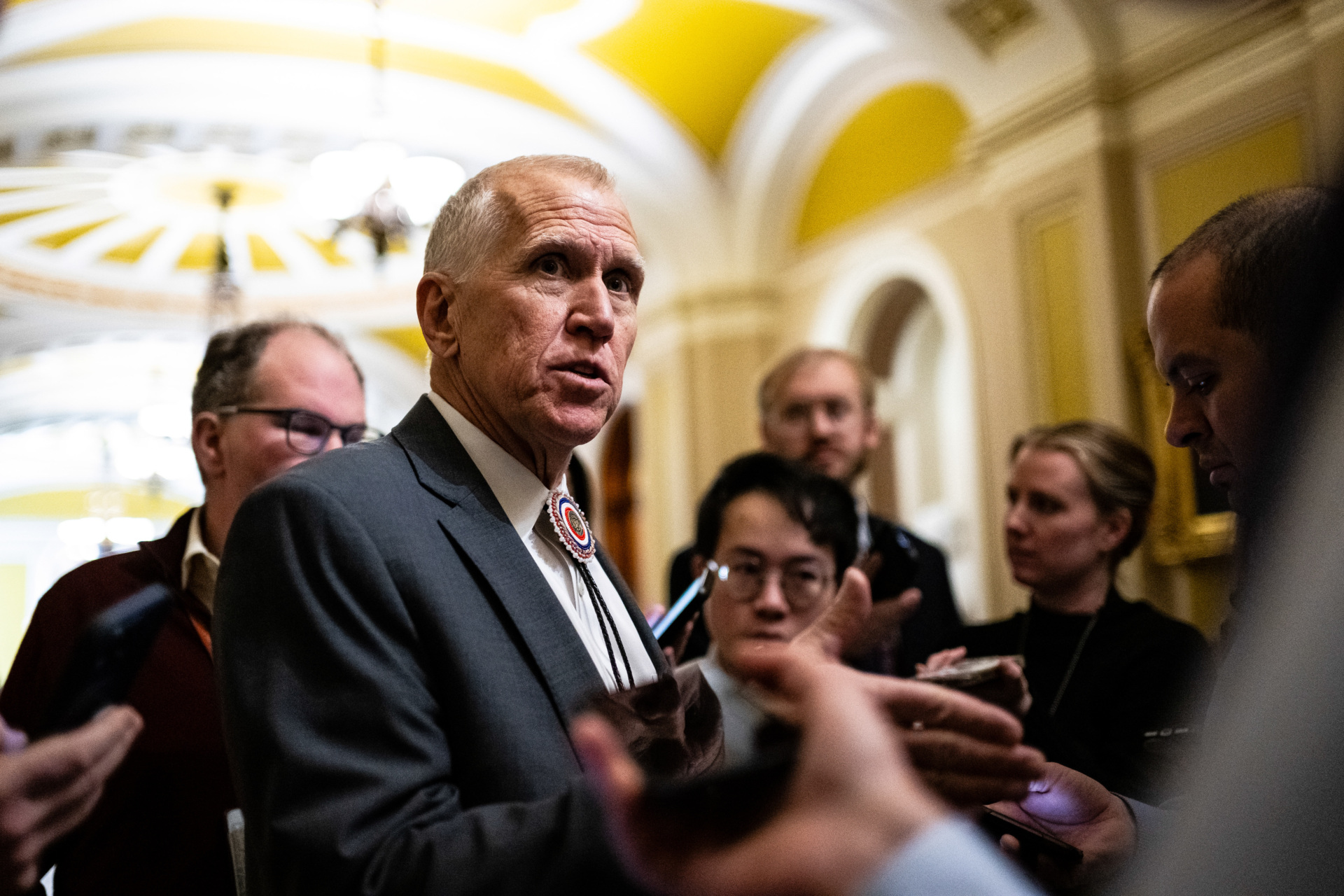 Senator Thom Tillis (R-NC) speaks to the press at the U.S. Capitol in Washington, DC, on Jan. 30, 2026. (Graeme Sloan/Bloomberg via Getty Images)