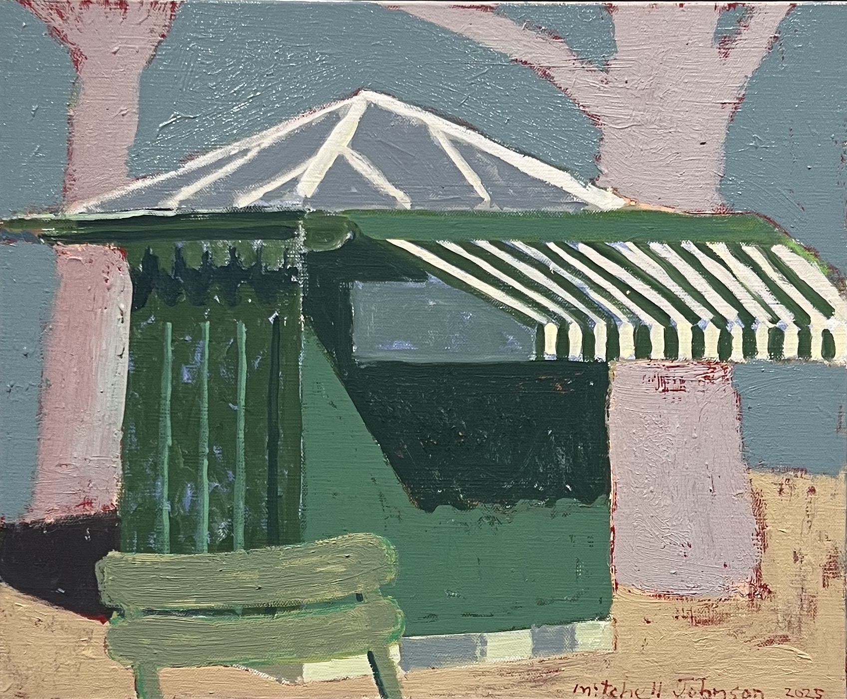 Johnson rarely includes people in his pictures. An exception in the exhibition is a painting of a young woman in a sundress with a mobile phone shading half her face. In another work we see a young girl launching a toy sailboat in a basin in Paris’s Luxembourg Garden. Johnson must have spent a lot of the autumn of 2025 in the Luxembourg, at least judging by the numbers of paintings set there. Luxembourg (Yellow and Orange) shows two shadowy figures standing on the garden’s sandy ground and chatting as they hold blue and red stripped umbrellas. Yellow and orange hues come from the tree leaves. Luxembourg Kiosk represents a shut green-and-white pavilion surrounded by large trees with majestic bare branches praying to the sky. Johnson’s art gives a sense of serenity, which is rare in a world of ever-increasing turmoil. The walls and bridge in Louvre (Blue and Red) (2025) seem of frozen sand; blue and red come from the boat passing under the bridge. Paris Ladder (2025) features green and pink rooftops and a white ladder sticking up among them, while Four Windows Rue Guisarde from the same year contains splashes of white paint on a sand-colored wall.