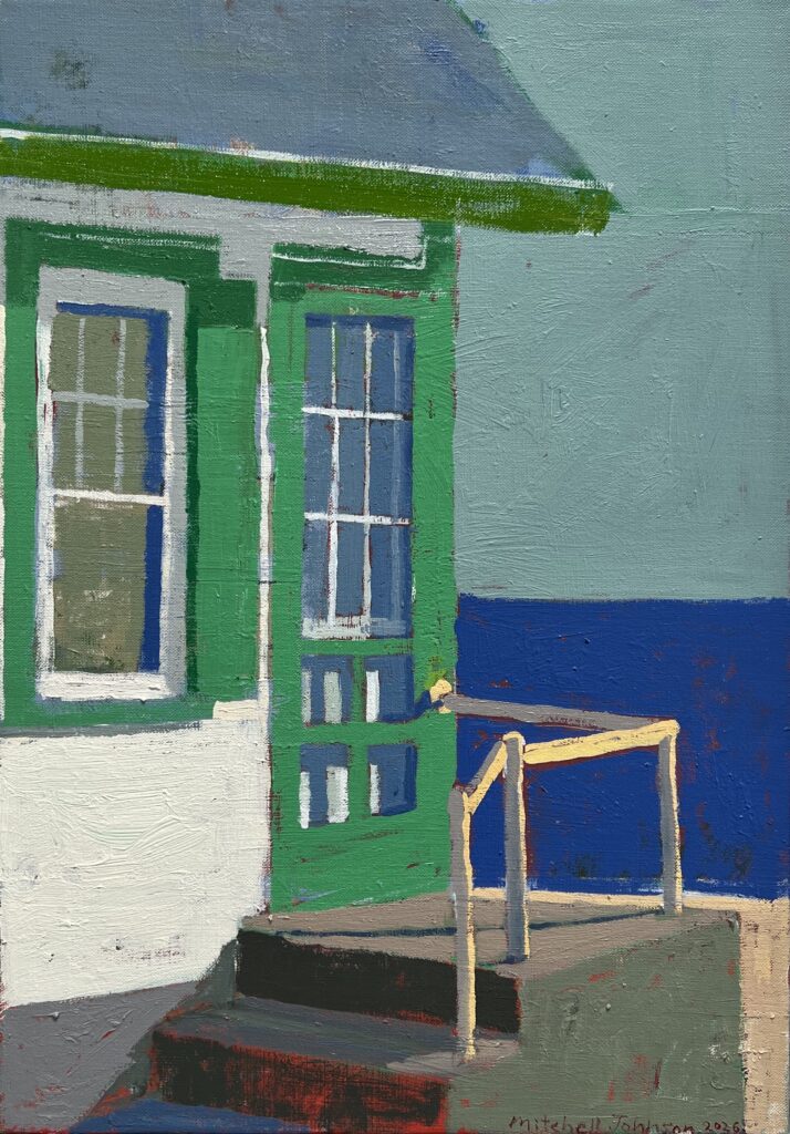 Paris and Aix were a revelation to Johnson, and he has been returning on a regular basis ever since. His Iranian-born wife, the writer and chef Donia Bijan, also has French connections, having studied at the Cordon Bleu culinary academy. It was only in 2018 that Johnson began painting in Paris while recovering from a bout of influenza there. Many of the twenty-five pictures in “Mitchell Johnson: Personal Color” in Galerie Mercier in Paris’s seventh arrondissement were made in the city during the last year, so the paintings are still fresh. The show also includes scenes of Tuscany, Morocco, New York’s Lower East Side, and North Truro, in Cape Cod, Massachusetts, which Johnson discovered in 2005. His son Luca reveals in an article for Whitehot Magazine that Johnson stays in the same motel room in Truro, from which he observes how the colors of the cottages’ walls change from “from bright white to soft grey” at different times of the day. Two magical pictures from 2025, each titled North Truro (Dusk), exemplify Johnson’s technique. At a casual glance, the two pictures may seem as identical as their titles, but differences emerge the longer you look. In one the cottage is closer to the viewer than the other and contains a flash of yellow light next to the window and close to the side door. Screen Door (North Truro), completed this year, shows the side of a white, green-shuttered house by a deep wintry-blue sea.