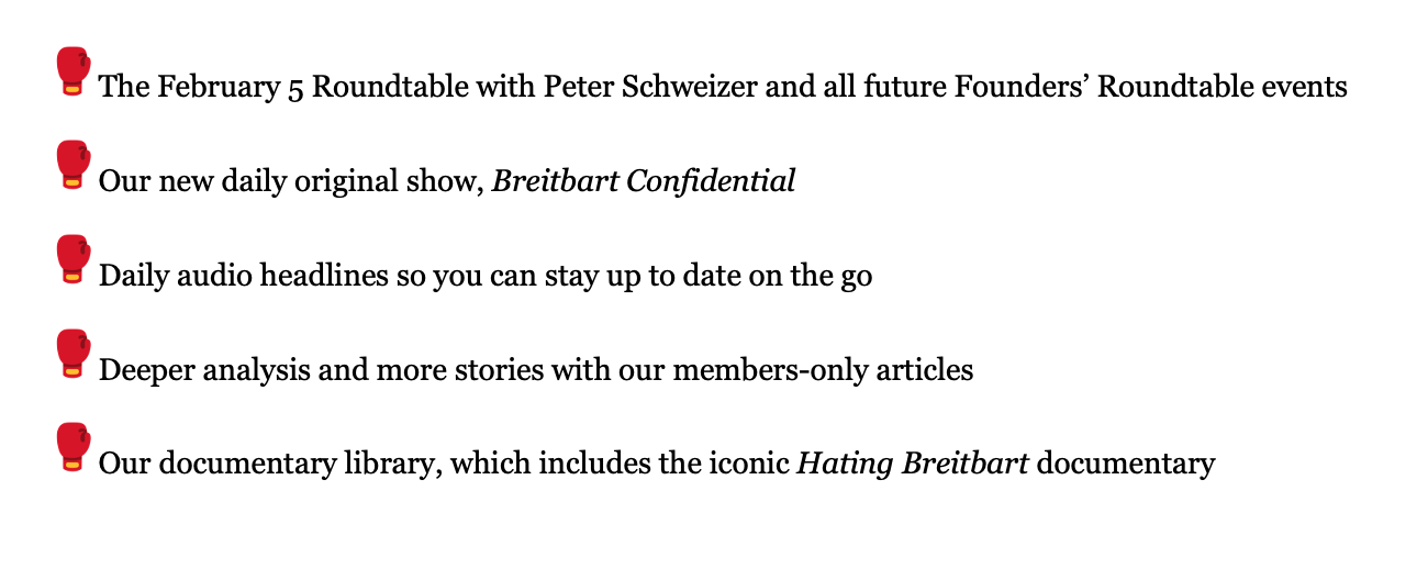 This online event is for Breitbart Fight Club Founders only – and you can be one by joining now. Select “Middleweight” membership or above, billed annually, and we’ll send you a VIP Pass. Just click the badge below: