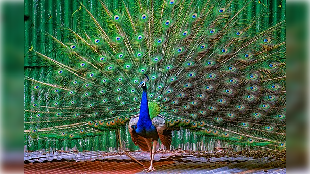 Peacock from Indore Zoo” by Mayur Madhwani licensed under CC BY 4.0. Cropped to 16:9