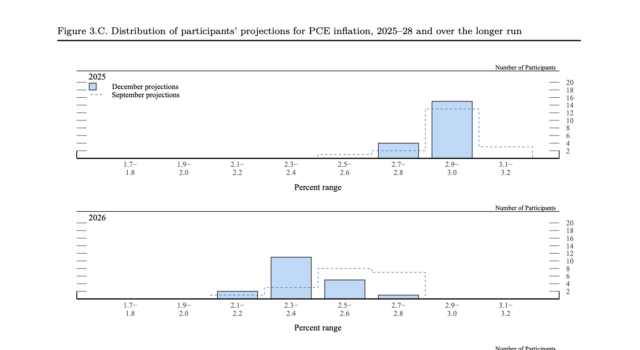The December Summary of Economic Projections tells the story in numbers. Look at Figure 3.C showing the distribution of inflation projections. In September, participants spread widely on 2026 forecasts, with a meaningful tail at 2.6 to 2.8 percent. That’s well above target, suggesting persistent tariff effects.