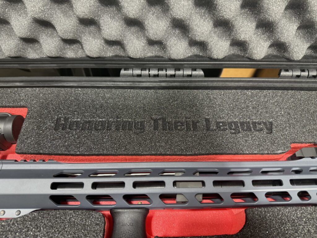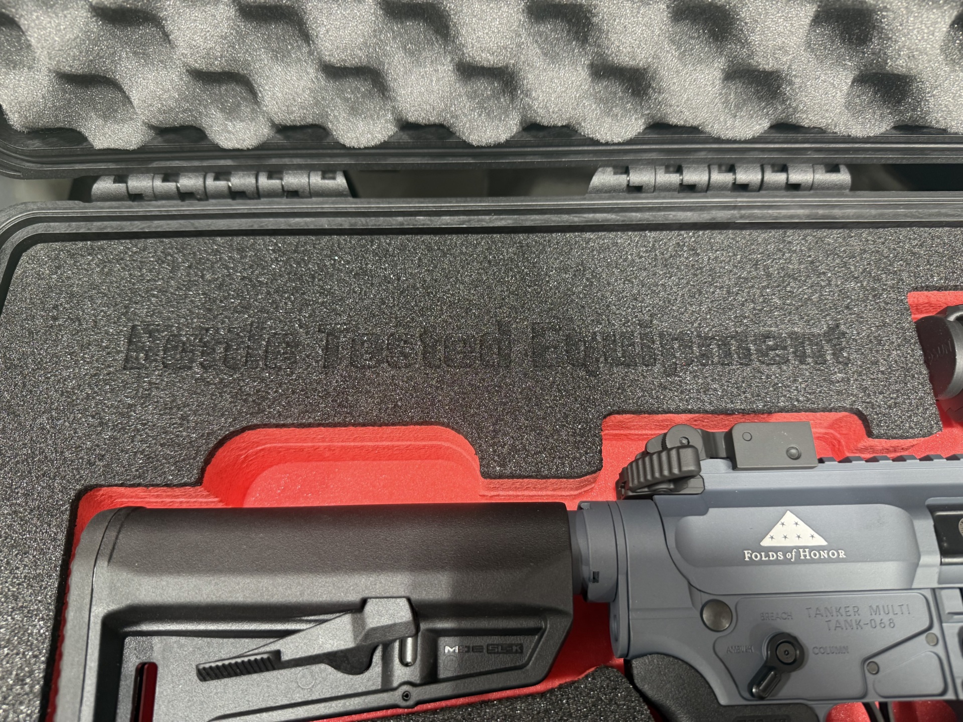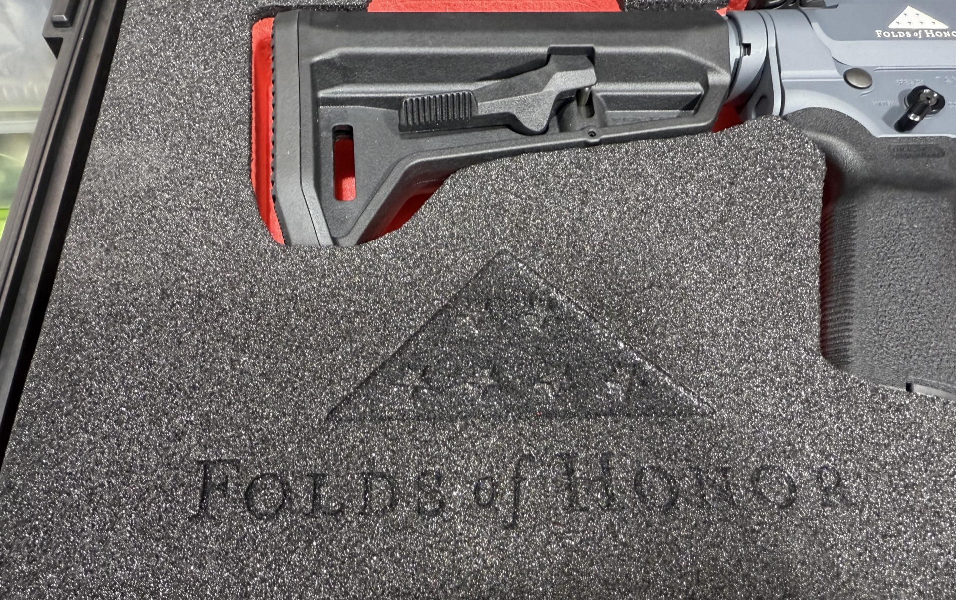 BTE-USA owners George and Geo Urmston donated a BTE-USA hand-crafted, match-grade rifle–the BATTLE TESTED Folds of Honor Tanker Carbine–to be sold for the purpose of raising money for scholarships. The rifle was built to include the Folds of Honor insignia and was presented in a custom-fitted Pelican case, with a Folds of Honor crest, a BTE-USA patch, and extra ammunition magazines.
