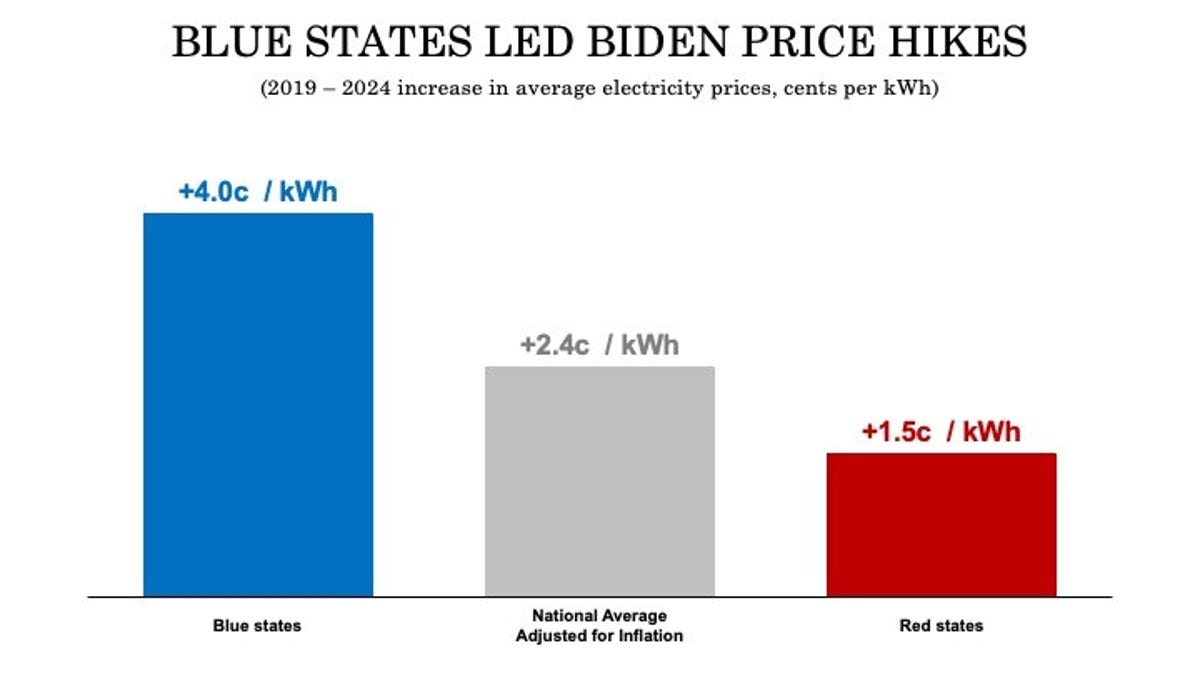 “While blue states saw an average increase of 4.0 cents per kilowatt-hour — the equivalent of $320 in added annual household electricity expenditures — red states saw an average increase of just 1.5 cents per kilowatt-hour, the equivalent of $175 in added annual household electricity expenditures,” Dietderich said.