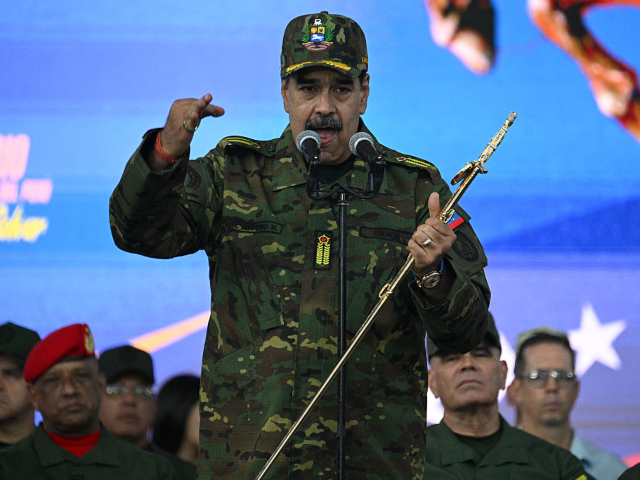 Venezuela’s President Nicolas Maduro delivers a speech while holding the Venezuelan independence hero Simon Bolivar’s ‘Sword of Peru’ during a military ceremony in Fuerte Tiuna, Caracas on November 25, 2025. (Photo by Federico PARRA / AFP via Getty Images)