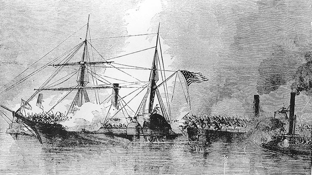In classic naval warfare tradition, once the Confederate ships got near the US Navy warships, they then deployed boarding planks to send Confederate Marines over to the US warships and utilized rams to further degrade the warfighting capabilities of Union warships.