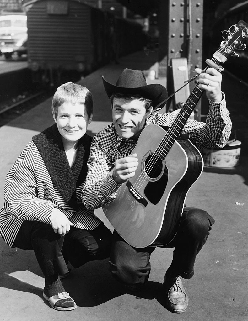 FLASHACK/File — U.S. country singer Ramblin Jack Elliott, with his wife June, playing the guitar in the street outside Waterloo Station, after arriving in the country on the Queen Elizabeth boat train, London, September 15th 1959. (William Vanderson/Fox Photos/Getty Images)