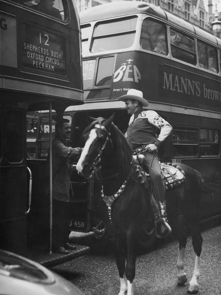FLASHBACK/File — Country and western singer Gene Autry (1907-1998) shakes hands with a bus driver as he rides his horse down Oxford Street in London, England, Great Britain, circa 1953. Autry, who gained fame as ‘The Singing Cowboy’ on the radio, in movies and on television, was in London for his 1953 tour of England. (Archive Photos/Getty)