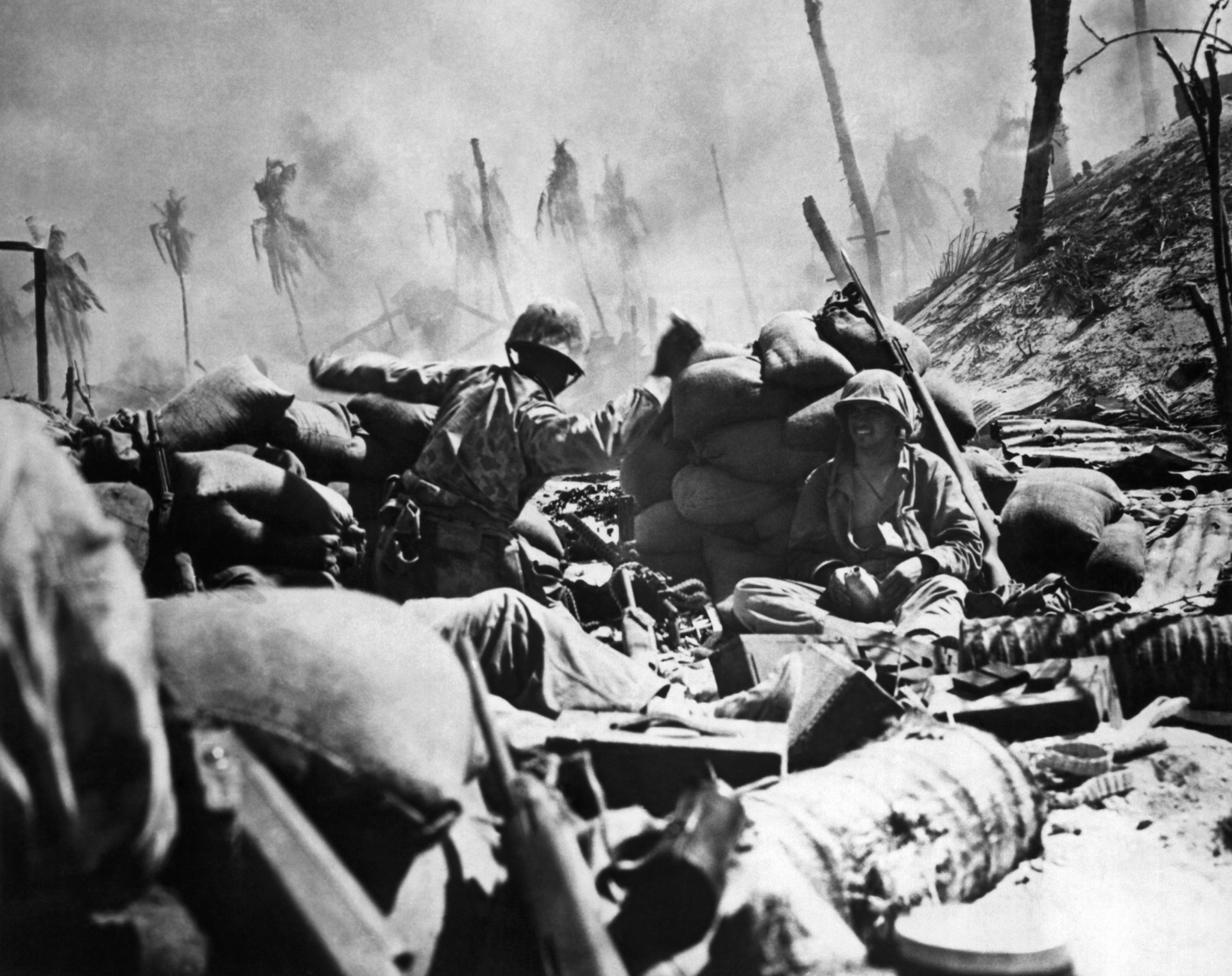 A U.S. Marine is seen throwing a hand grenade during the battle on the Japanese-held island of Tarawa in November 1943. (Underwood Archives/Getty Images)