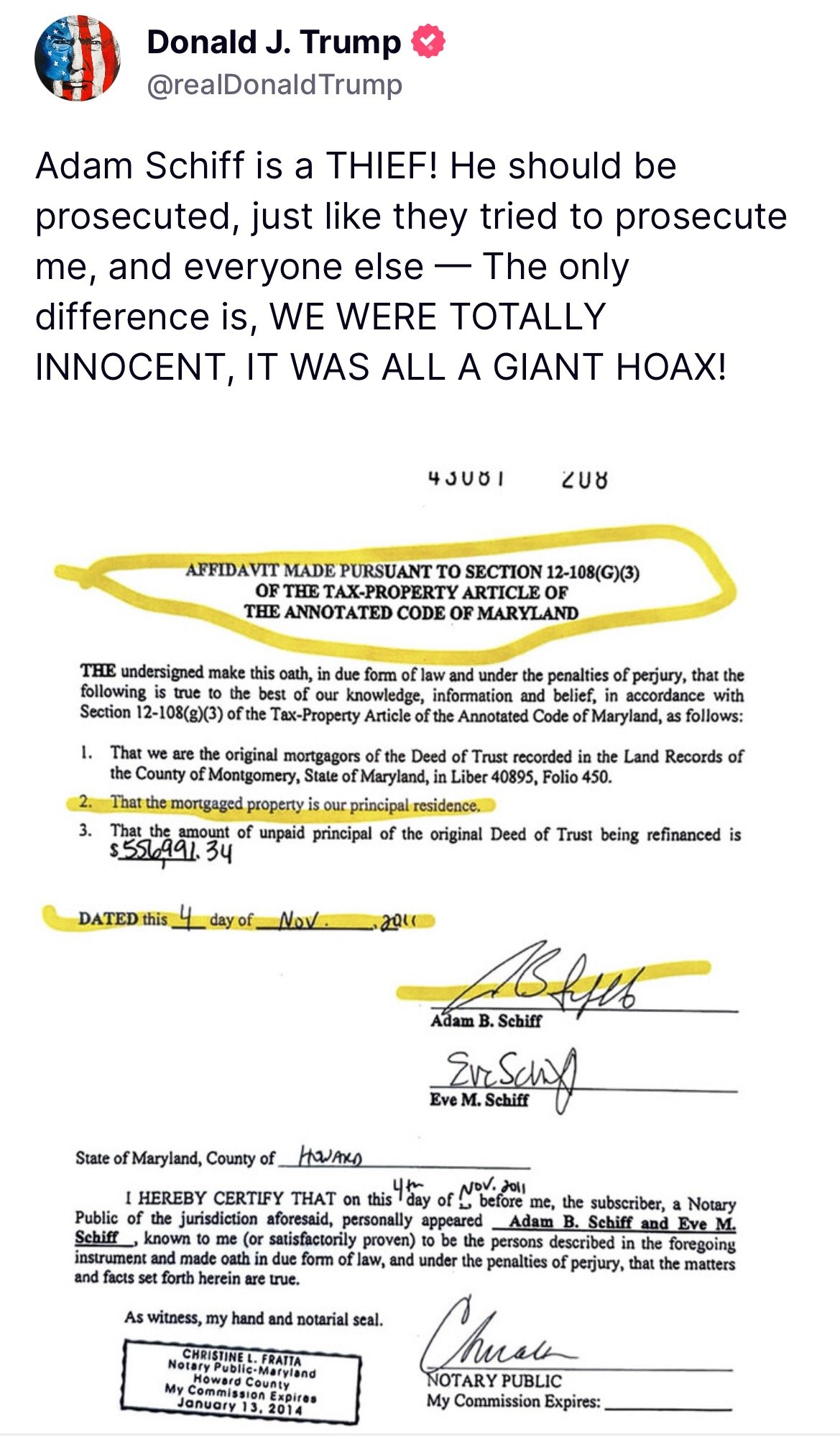 President Trump attached a screenshot of a signed and notarized affidavit that Schiff signed proclaiming the mortgaged property in Maryland is his “principal residence.”