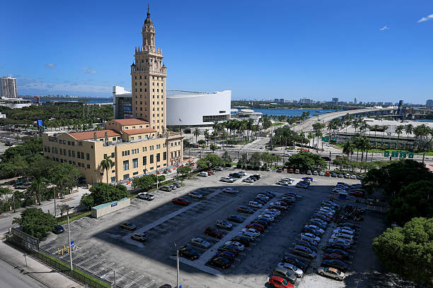 Aerial view of Miami's Freedom Tower alongside a parking lot, with modern buildings and palm trees in the background under a clear blue sky.