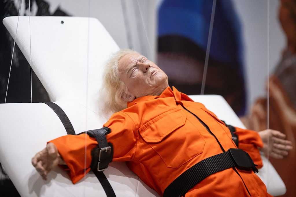 A masked London-born agitpropist who calls himself Mason Storm recently contributed to this unhinged anti-Trump genre with a hyper-realistic, life-size sculpture of the president dressed in an orange prison jumpsuit and set on a cross-shaped gurney in a cruciform pose. The sculpture, which is titled “The Saint or the Sinner,” depicts Trump as incapacitated with the implication — made explicit elsewhere — that he is dead as the result of a lethal injection.