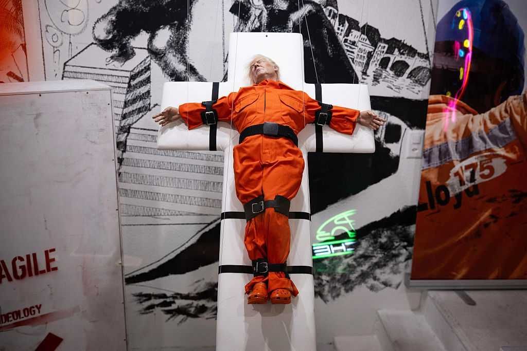 A masked London-born agitpropist who calls himself Mason Storm recently contributed to this unhinged anti-Trump genre with a hyper-realistic, life-size sculpture of the president dressed in an orange prison jumpsuit and set on a cross-shaped gurney in a cruciform pose. The sculpture, which is titled “The Saint or the Sinner,” depicts Trump as incapacitated with the implication — made explicit elsewhere — that he is dead as the result of a lethal injection.