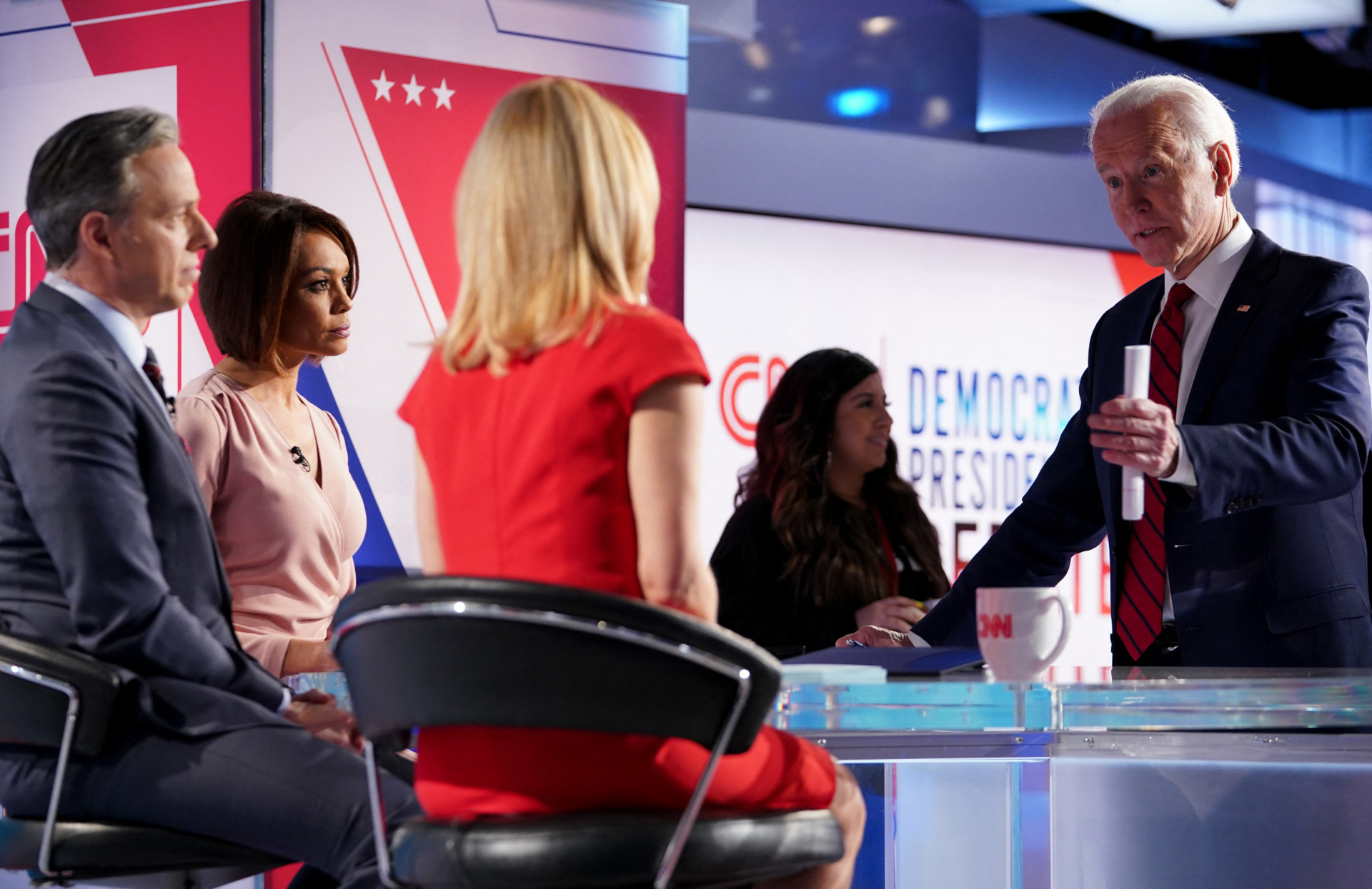 Democratic presidential hopeful former US vice president Joe Biden talks with moderators (L-R) Univision’s journalist Ilia Calderon, CNN chief Washington correspondent Jake Tapper and CNN political correspondent Dana Bash at the end of the 11th Democratic Party 2020 presidential debate in a CNN Washington Bureau studio in Washington, DC on March 15, 2020. (MANDEL NGAN/AFP via Getty Images)