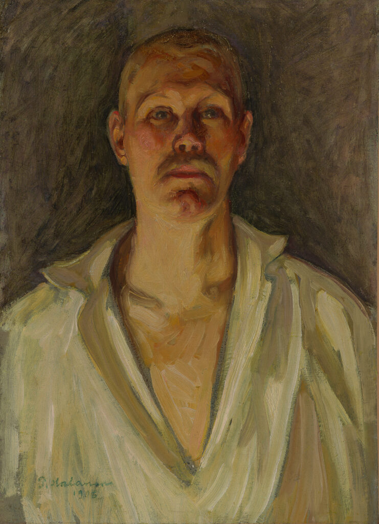 Pierre Puvis de Chavannes’ classicism as well as Gauguin’s influence can be seen in After the Music Lesson (1894), showing Halonen’s sister-in-law Aino holding a guitar. Halonen came from a musical family. His brother Heikki, a professional musician, was the subject of The Violinist (1900), and the composer Jean Sibelius was a close family friend. In 1895 Pekka married Maija Mäkinen, a pianist who often played for him while he painted. Halonen himself performed with the kantele, a traditional Finnish stringed instrument similar to a zither which is played on a table. In 1891 the artist Eero Järnefelt painted Halonen playing the instrument next to a table with a bright-red lampshade against a subdued red sofa; the warm color scheme is reminiscent of Vuillard. Halonen’s The Kantele Player (1892) shows a musician whose eyes seem almost in a trance as he strums his runes. Emerging from the black shadow, he could be straight out of a seventeenth-century painting. Something similar can be said of Halonen’s Self-portrait (1906), in which the artist, dressed in a V-necked, tieless white shirt, looks like he’s playing the part of Hamlet.