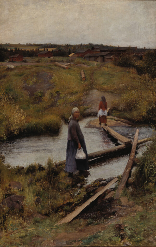 Introduced to painting by his father, Pekka Halonen was trained at the Society of Drawing and Fine Arts at Helsinki. Halonen went on to study in Paris, first at the Académie Julian in 1890, and then at the Académie Colorossi in 1893. Such sojourns in the world’s art capital were considered essential for any aspiring European artist. In Paris, Halonen was greatly impressed by Paul Gauguin and transferred to the Académie Vitti so that he could study with the master, who had just returned from Tahiti. Aside from Primitivism, he learned from other current French movements, including Post- Impressionism and the Nabis, but he was also influenced by the Japonisme then in fashion and the early Italian Renaissance, which he studied not only at the Louvre but also in Italy. Nordic painters of his generation studying in Paris also learned from Jules Bastien-Lepage’s naturalistic style, and Halonen was no exception, as is evident in The Shortcut (1892). The oil shows two women crossing a lake on a makeshift bridge, walking towards a village in the background across a muted, green meadow. One woman turns to look out towards the viewer, but her face is too blurry to make out.