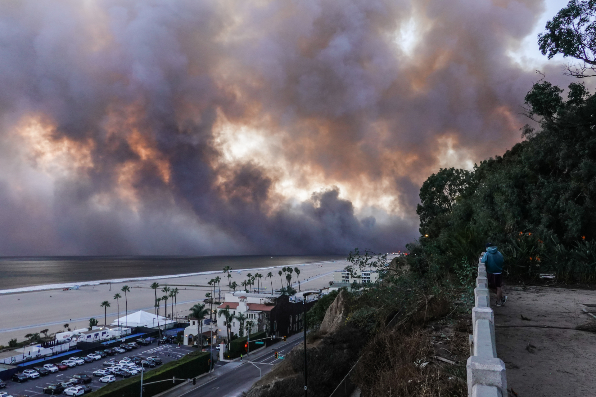 Smoke rises over the coastline as wildfires burn in Pacific Palisades, California, on January 7, 2025. (Jason Ryan/NurPhoto via Getty Images)