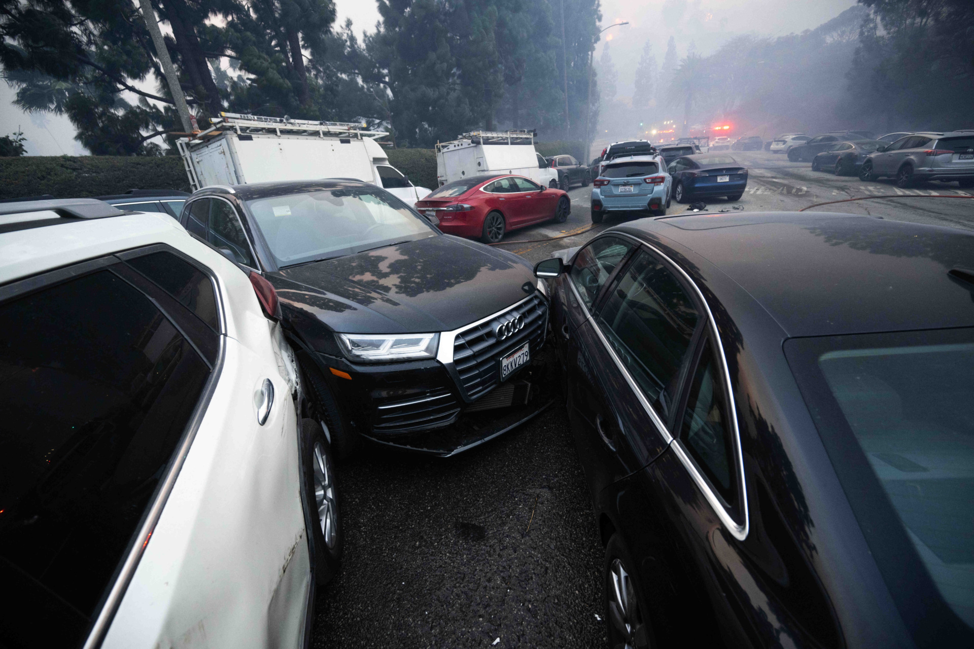 Abandoned vehicles sit piled up along Sunset Boulevard during the Palisades fire on January 7, 2025, in Pacific Palisades, California. (Sarah Reingewirtz/Getty Images)