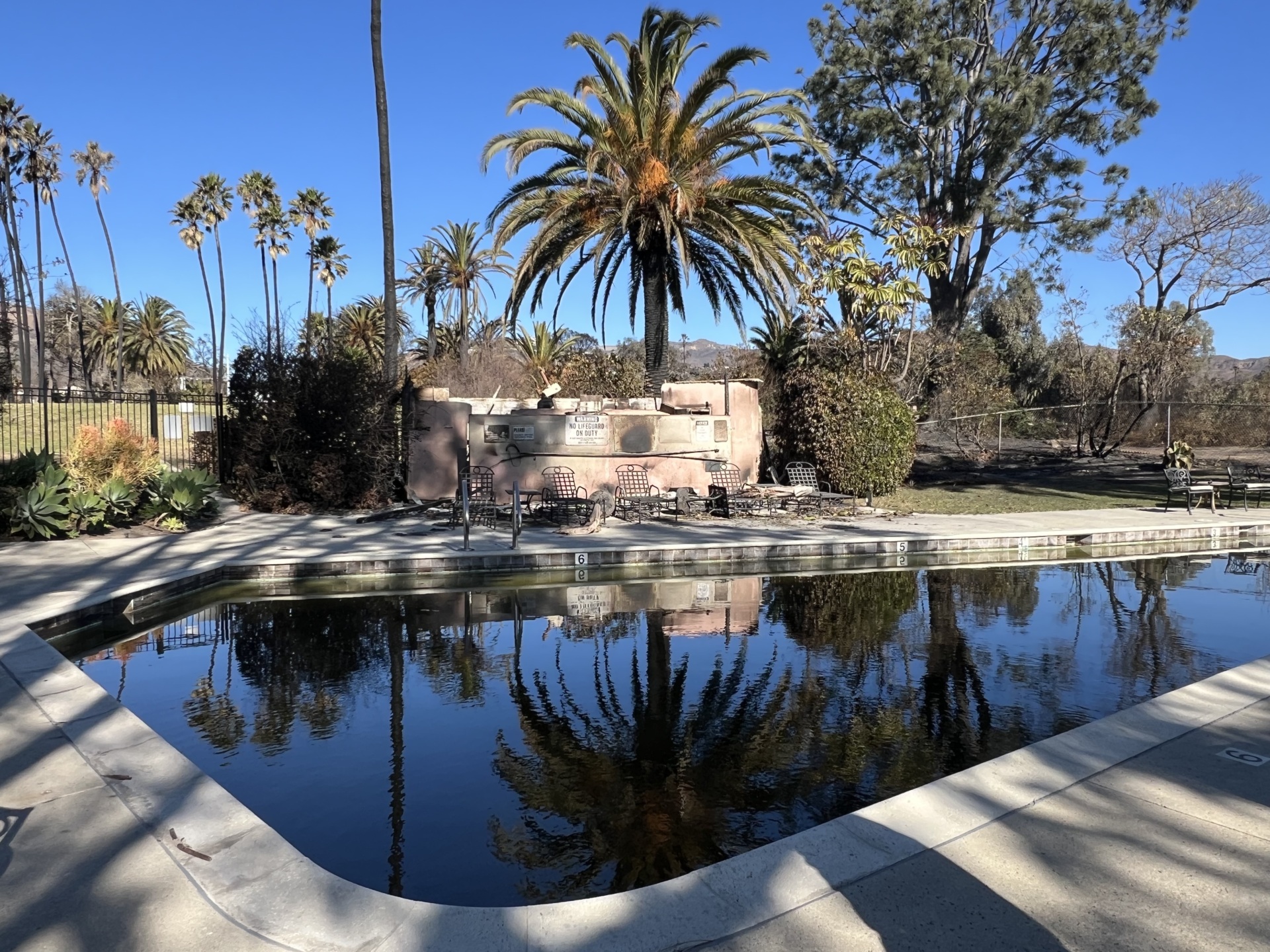 After the fire, the water black with ash and pool house only a burnt shell. (Photo by Joel Pollak)