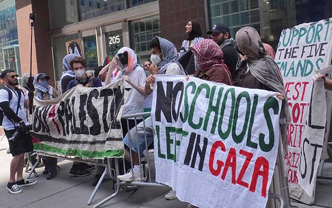 “We are seeing faculty members who are facing not just discipline but termination for the crime of expressing solidarity with the fight for Palestinian human rights,” he said, after putting on the PSC-CUNY hat. “I know that this is a repression that is not unique to Brooklyn College. It is a repression that extends even to the ways in which we choose when to send police officers onto college campuses.”
