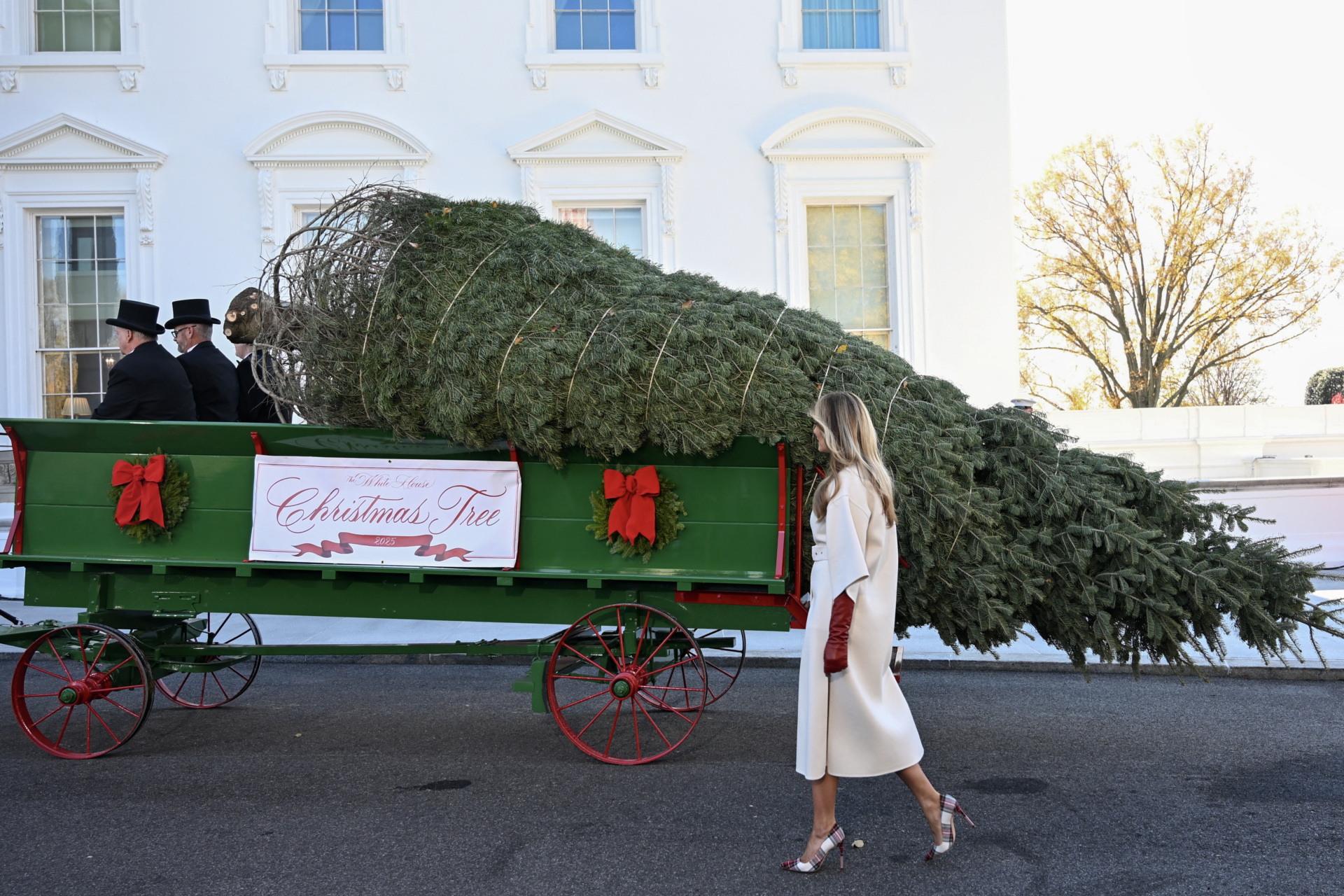 First lady Melania Trump welcomes the official 2025 White House Christmas Tree at the White House in Washington, DC on November 24, 2025. (Alex WROBLEWSKI / AFP via Getty Images)