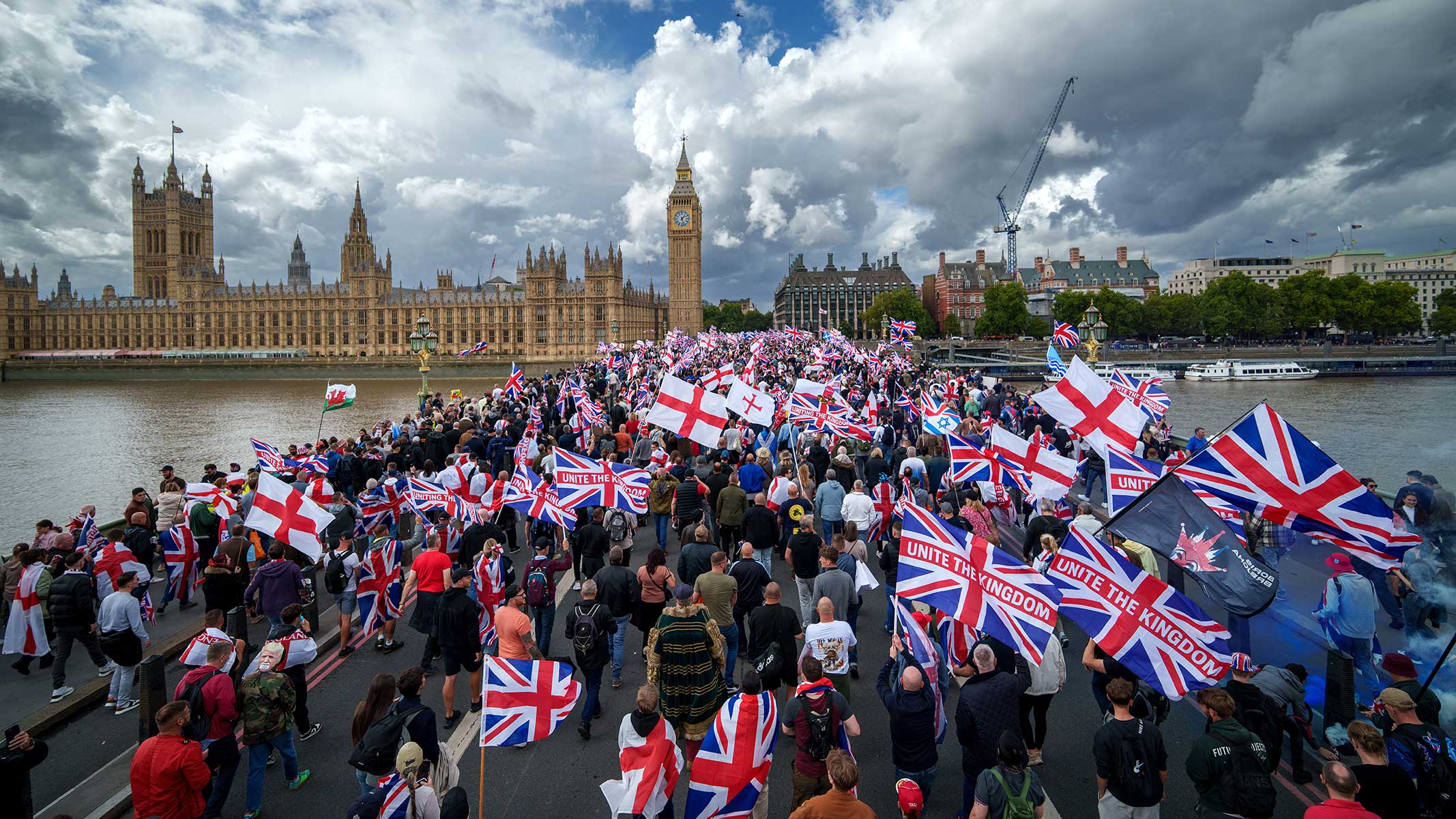 Two days before our lunch, “Unite the Kingdom,” one of the largest demonstrations in Britain’s modern history, drew a crowd of well over 100,000 people into London’s streets. It was led by controversial free-speech activist Tommy Robinson, often derided as “far-right” and whose own views have gotten him in trouble with the law. Hundreds of police officers cordoned off Trafalgar Square, leaving open a small corridor to Nelson’s Column, where a vanguard of marchers sang “God Save the King,” “Rule Britannia,” and other patriotic songs. Many waved the Union Jack or the St. George’s Cross—the flag of England—both of which have become popular symbols of national sovereignty and resistance to Starmer’s increasingly disfavored government.
