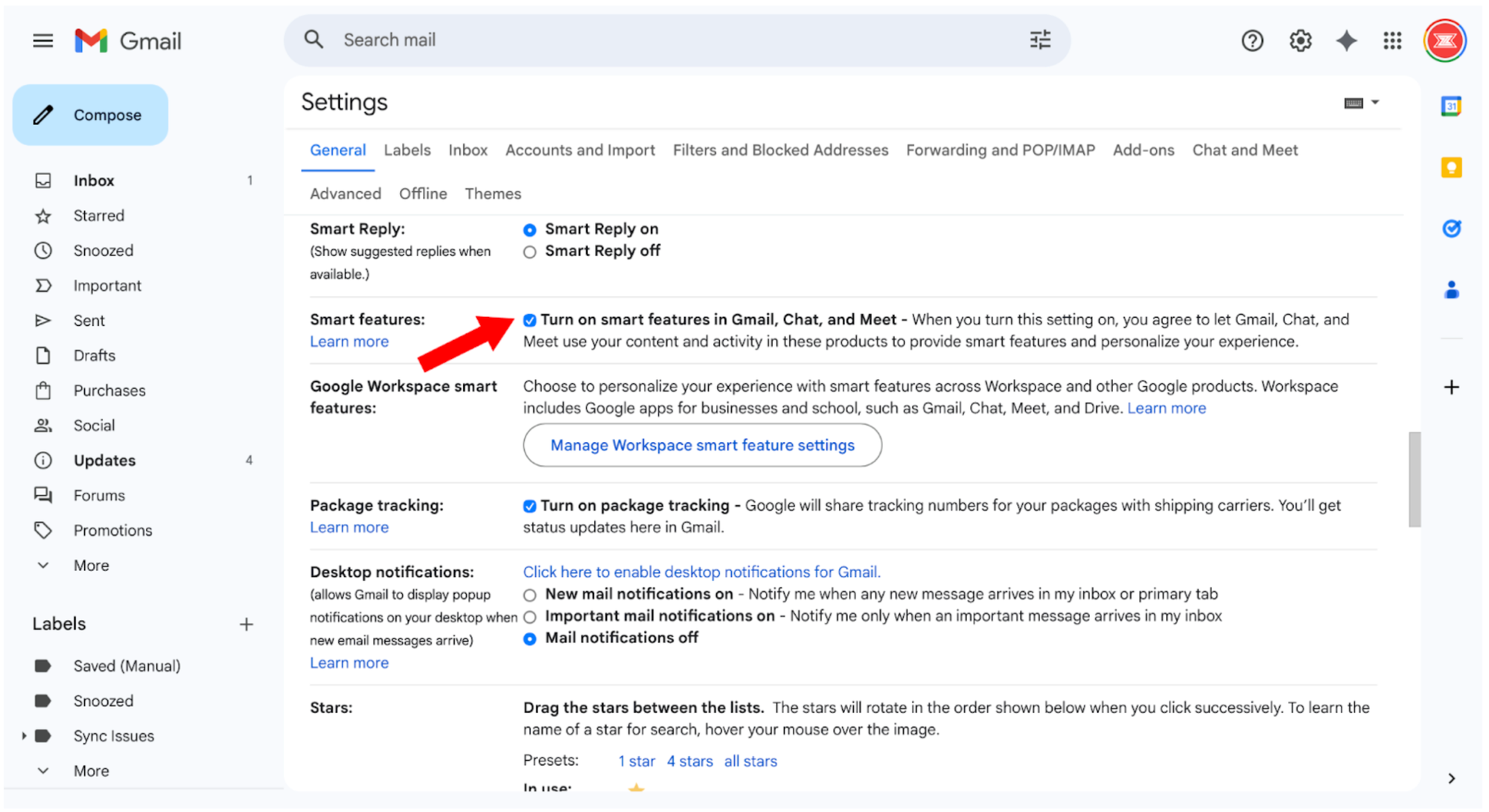 4. Now that you’re in the Settings page, scroll down to the section that says “Google Workspace smart features.” This is the setting that gives Gemini direct access to your content.