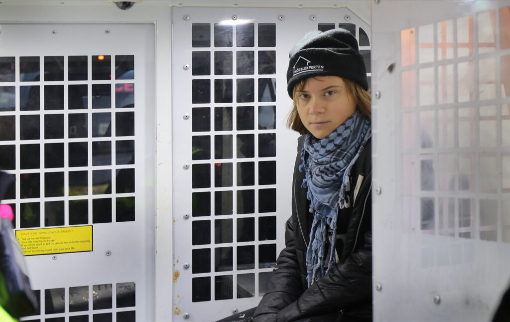 Activist Greta Thunberg is arrested and sits in the back of a police van outside the offices of Aspen Insurance on December 23, 2025 in London, England. (Martin Pope/Getty Images)