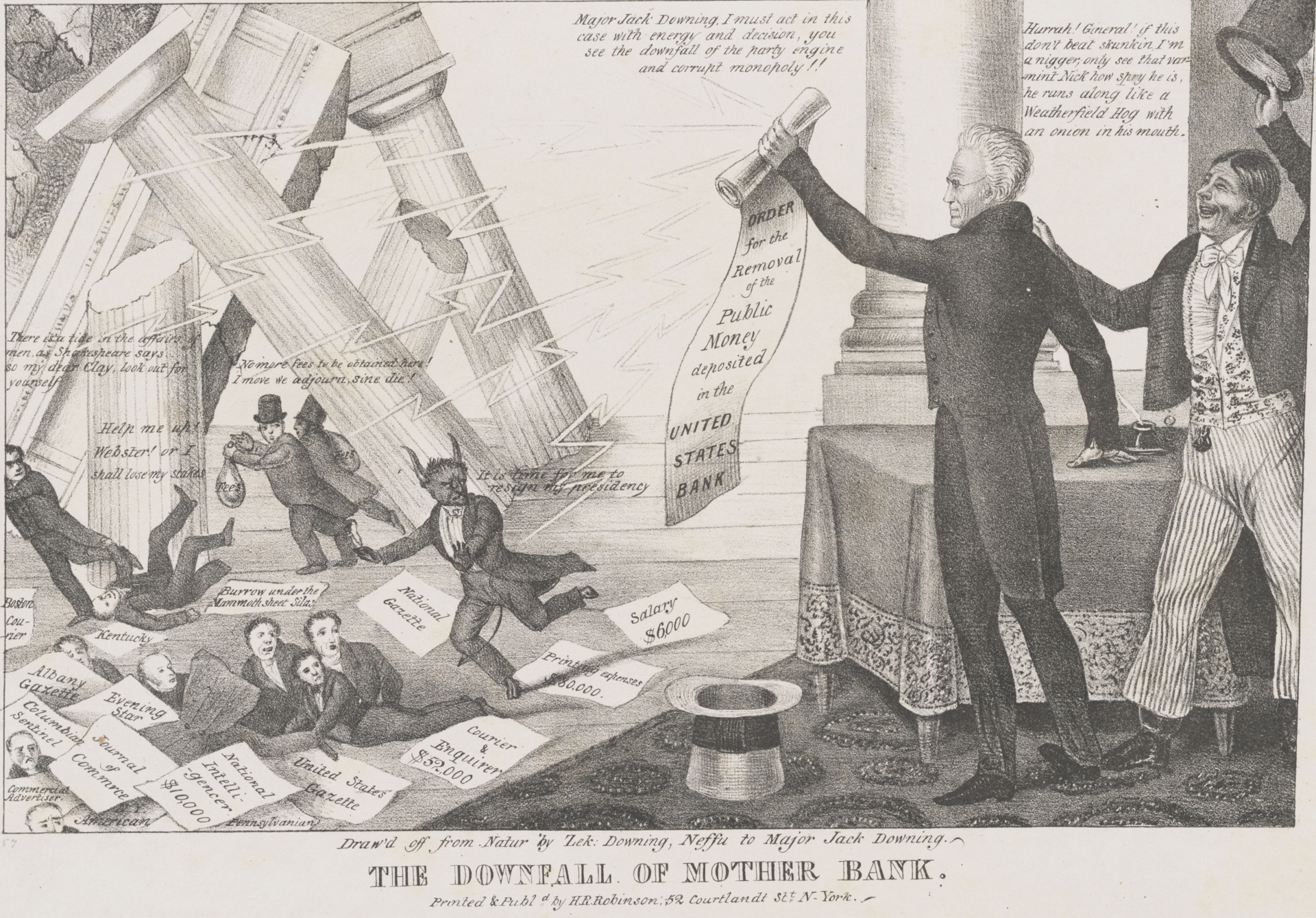 An 1833 lithograph cartoon showing President Andrew Jackson destroying the Second Bank of the United States with his “Removal Notice.” Lithograph by Zachariah Downing, published by Henry R. Robinson. (Library of Congress via Wikimedia Commons)