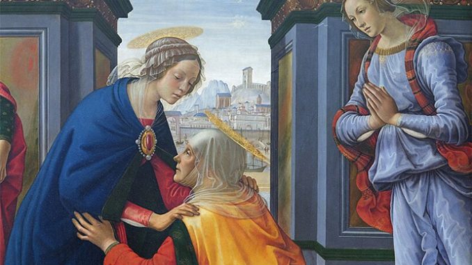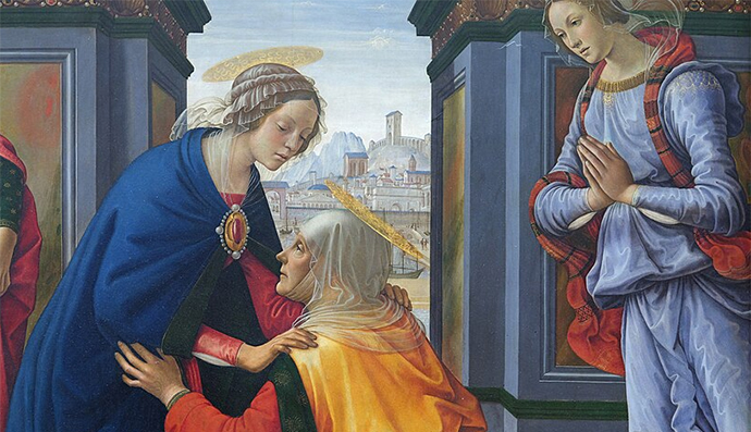 The Visitation, in particular, manifests how we should recognize Jesus’ divine presence in the womb of the Virgin Mary. Elizabeth speaks for all humanity, welcoming the Son of God into the world with the words, “Blessed is the fruit of your womb,” a line that echoes throughout history in our daily prayers. She is overwhelmed by the presence of her incarnate Savior, speaking with awe and gratitude, “Who am I that the Mother of my Lord should come to me?” Ghirlandaio depicts her reverence so fittingly in his painting of the Visitation: