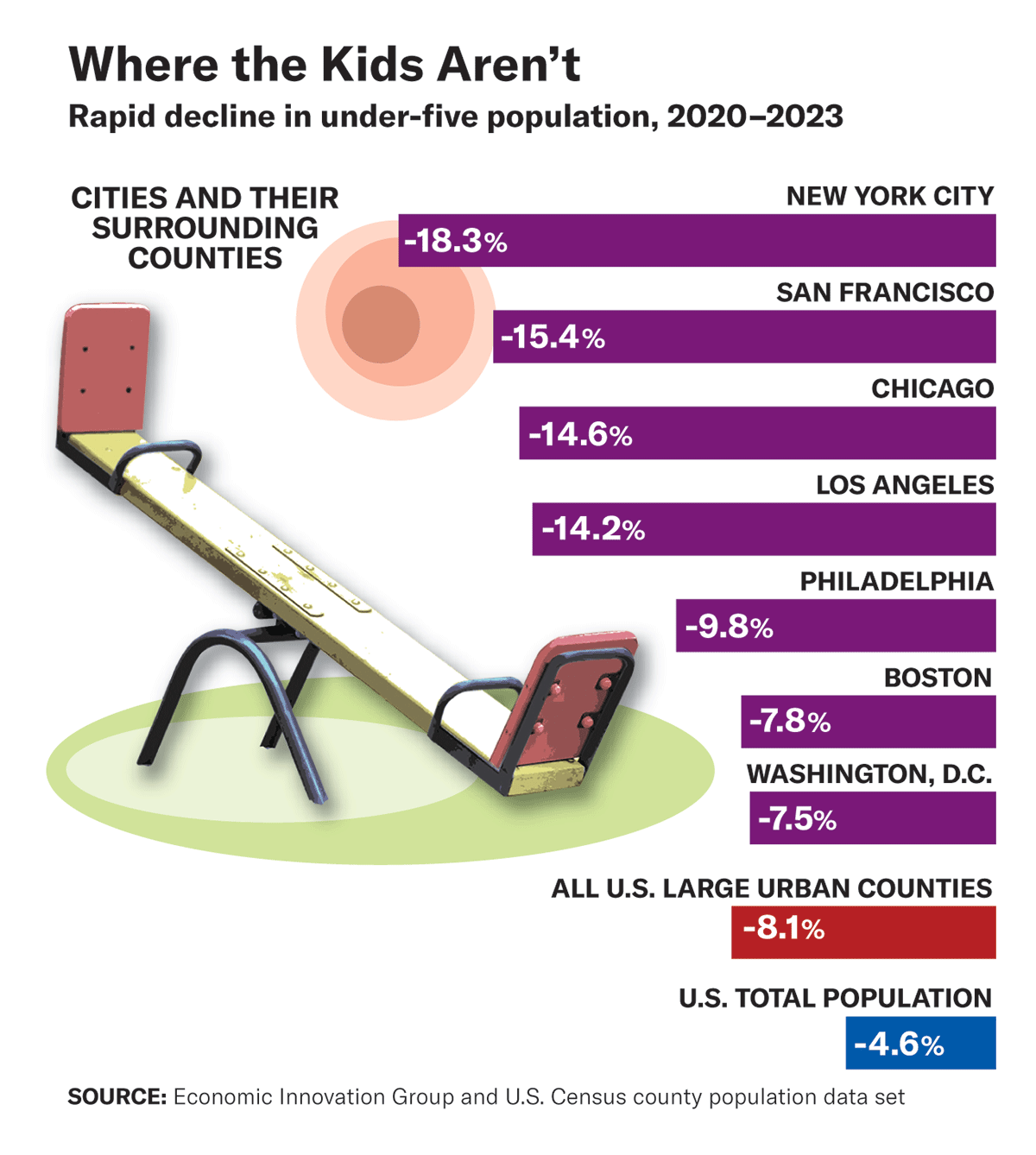 Many of these migrating workers have families with children. A map showing changes in the population of children under five by county since 2020 resembles the new geography of the American worker. Big cities have experienced significant declines in their populations of young children. New York’s number of children under five has fallen 18 percent; San Francisco’s, 15 percent; and Los Angeles’s and Chicago’s, more than 14 percent. The drop supports the view that many domestic migrants are fleeing large urban school districts, which kept students in remote learning far longer than others during the pandemic—contributing to troubling drops in academic performance. Some of the largest school districts have since suffered major enrollment falloffs, setting off budget crises. Though the family-migration rate has recently slowed somewhat from the pandemic years, urban counties are still a long way from recapturing those lost workers and their children.