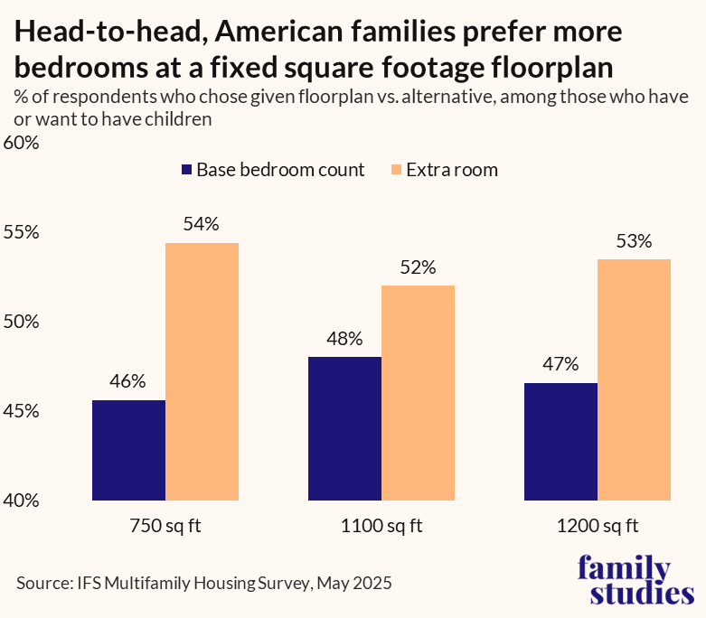 We found, across every method we checked, compelling evidence that Americans prefer apartments with more bedrooms. For the 750-square-foot floor plans, we even found that childless-by-choice respondents had stronger preferences for the extra-room floor plan than family-minded respondents! And yet over 90 percent of 750-square-foot apartments built in America today will be one bedroom—or none.