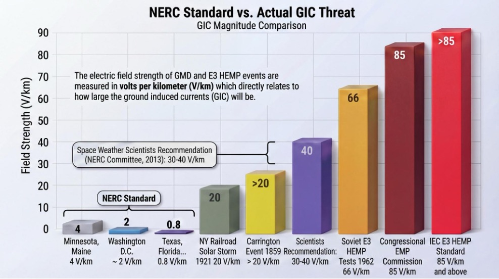 Even more nonsensical, this benchmark was not derived from North American storm data. It ignored the 1921 Railroad Storm (measured at 19–20 V/km), the 1989 event (peaks of 21.66 V/km in Maine, 19.02 V/km in Virginia), the Soviet HEMP tests over Kazakhstan in 1962 that achieved 66 V/km at the exact geomagnetic latitude of Washington, DC, and it ignores the International Electrotechnical Commission’s updated 2025 standard of 85 V/km for E3 HEMP protection.