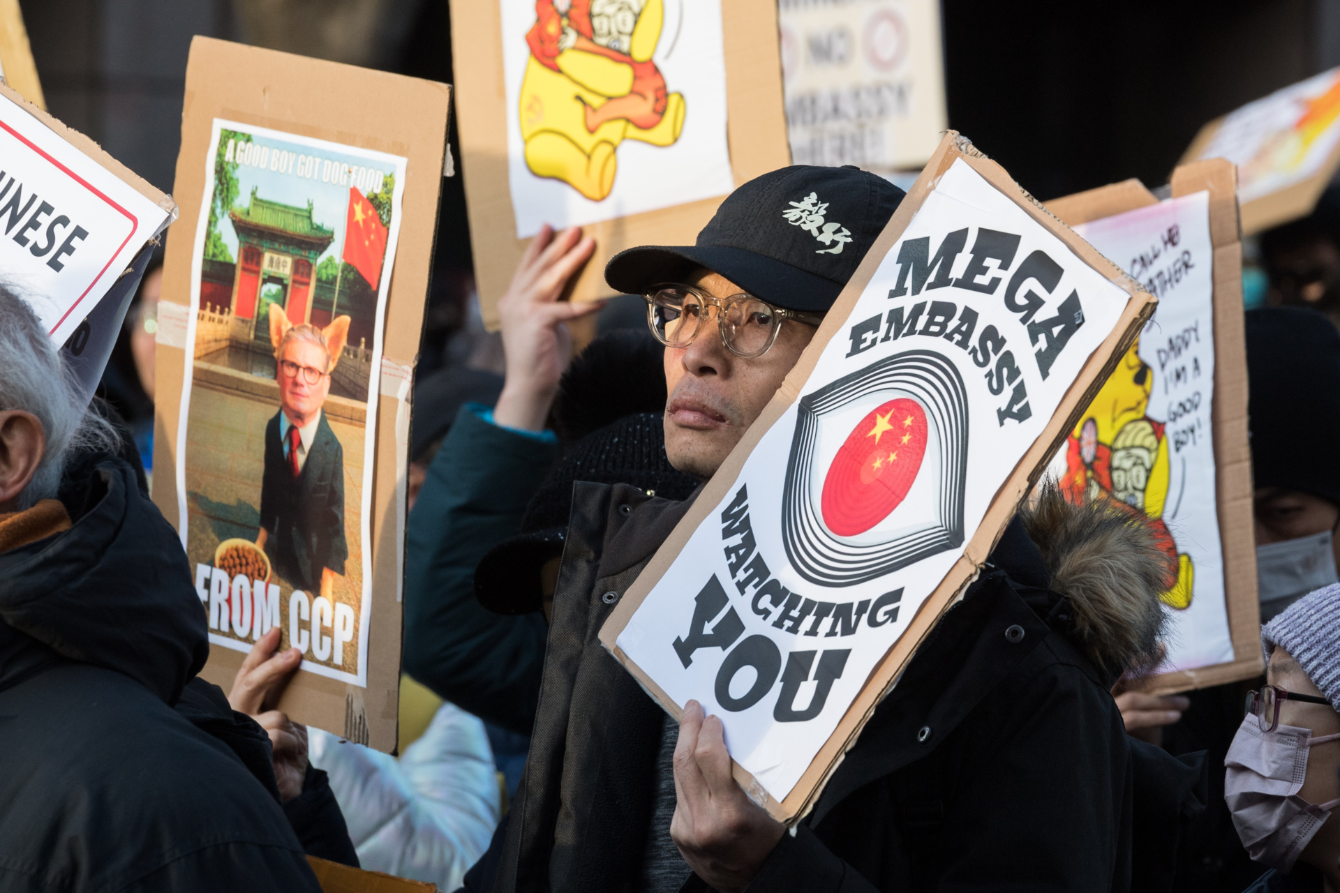 Others read: “CCP (Chinese Communist Party) is watching you. Stop the mega embassy.”