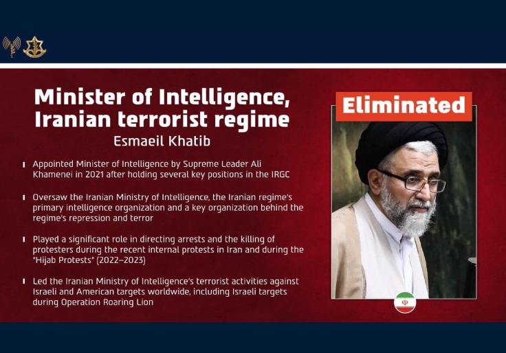 Israel on Wednesday killed Iran’s intelligence minister, Esmaeil Khatib, during an airstrike in Tehran, according to the Israel Defense Forces. Khatib orchestrated the violent crackdown on protesters earlier this year and ran an agency that attempted assassinations against U.S. officials.