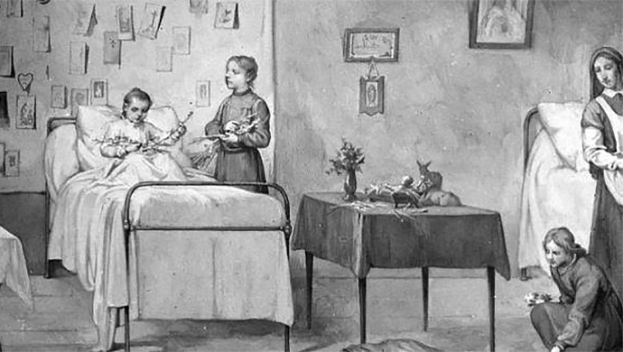 Nellie loved the school and loved the Sisters. She called each of them “Mother.” Granted, she spoke with the lisp of a child who was not yet four, and she occasionally showed the temper of a preschooler. But the sisters also noticed that she always apologized when she was corrected. And when a sister looked carefully at the child after one of those outbursts, she realized that Nellie had a crooked spine. Suddenly, Nellie’s occasional bad temper, off-balance walking, and discomfort when sitting for long periods made sense; the little girl was simply in a lot of pain.