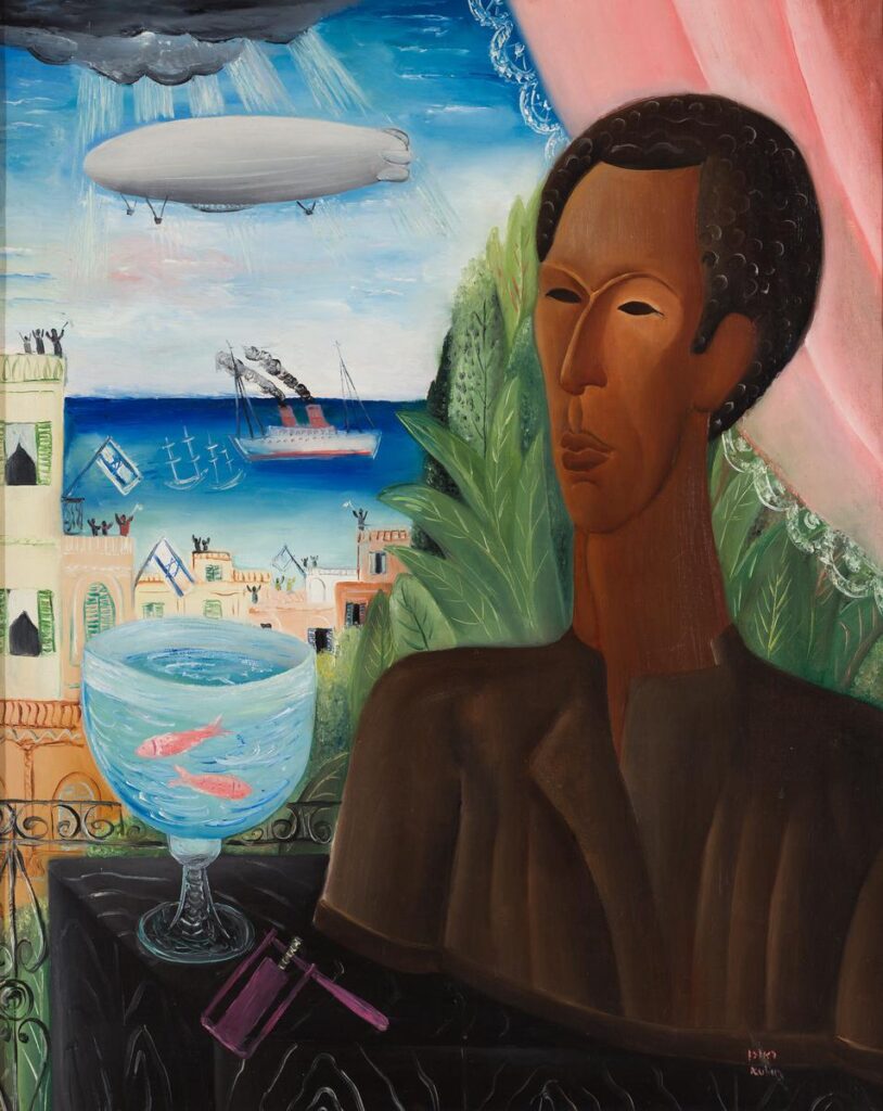 Rubin’s numerous scenes of a nascent Tel Aviv also highlighted Jewish progress and modernity. In Tel Aviv Seashore (1923–24), the Mediterranean tranquility embodied in the city’s first homes and sandy roads is interrupted by electric cables and a passing steamship. In Zeppelin over Tel Aviv (1929), the African-masked statue of Rubin that was carved by his contemporary Chana Orloff stands on a balcony terrace and looks out over a city full of three-story buildings as residents rush to welcome the arrival of an ocean liner and a zeppelin. As Jewish modernity was taking shape in Palestine, Rubin captured its essence through a naive simplicity reminiscent of the primitivism of Paul Gauguin.