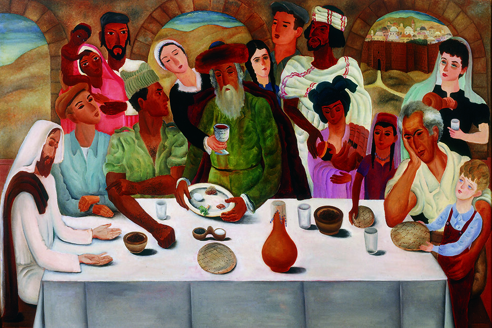 The First Seder in Jerusalem (1950) pays tribute to the establishment of the state of Israel with a theme inspired by Leonardo da Vinci’s The Last Supper (which was also the last Seder in Jerusalem for Jesus). Secular and religious immigrants, a Palmach soldier, and a rabbi—each given a didactic role in the rebirth of Jewish nationalism—gather for an imagined first Passover Seder in the new state. At one end of the table, however, sits a somewhat uninterested Rubin matched by a forlorn Jesus at the opposite end.