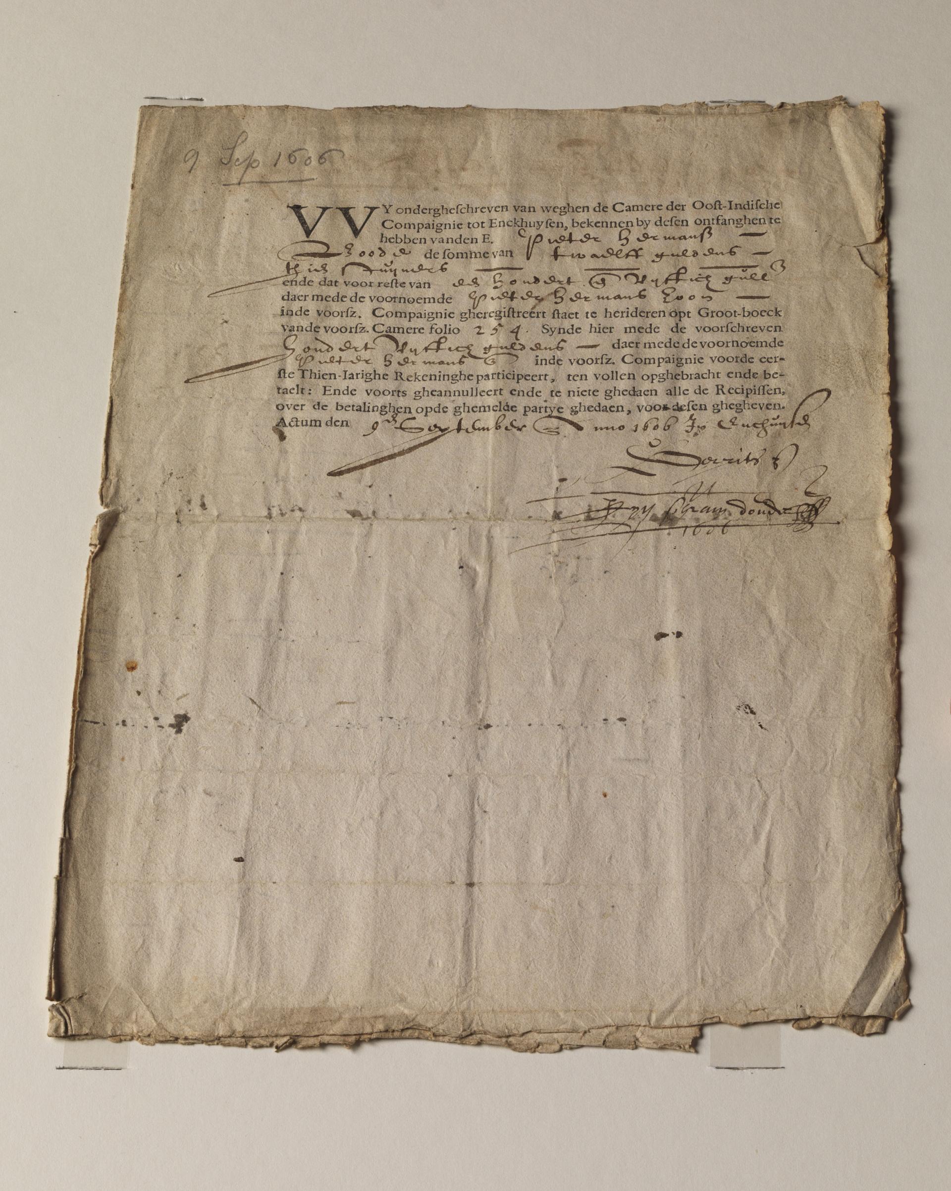 A photograph of the world’s first and oldest known share certificate, which was issued in Enkhuizen, the Netherlands, on September 9, 1606, by the former Dutch East India Company (Verenigde Oostindische Compagnie or VOC). (Michel Porro/Getty Images)
