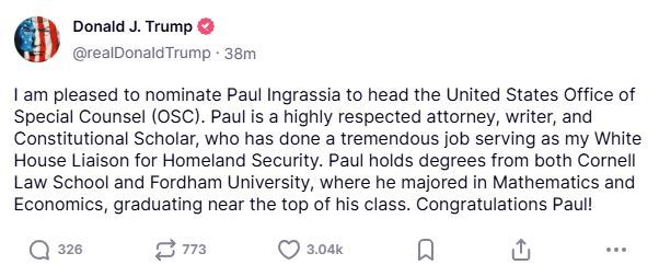 Paul Ingrassia: I will be withdrawing myself from Thursday’s HSGAC hearing to lead the Office of Special Counsel because unfortunately I do not have enough Republican votes at this time. I appreciate the overwhelming support that I have received throughout this process and will continue to serve President Trump and this administration to Make America Great Again!