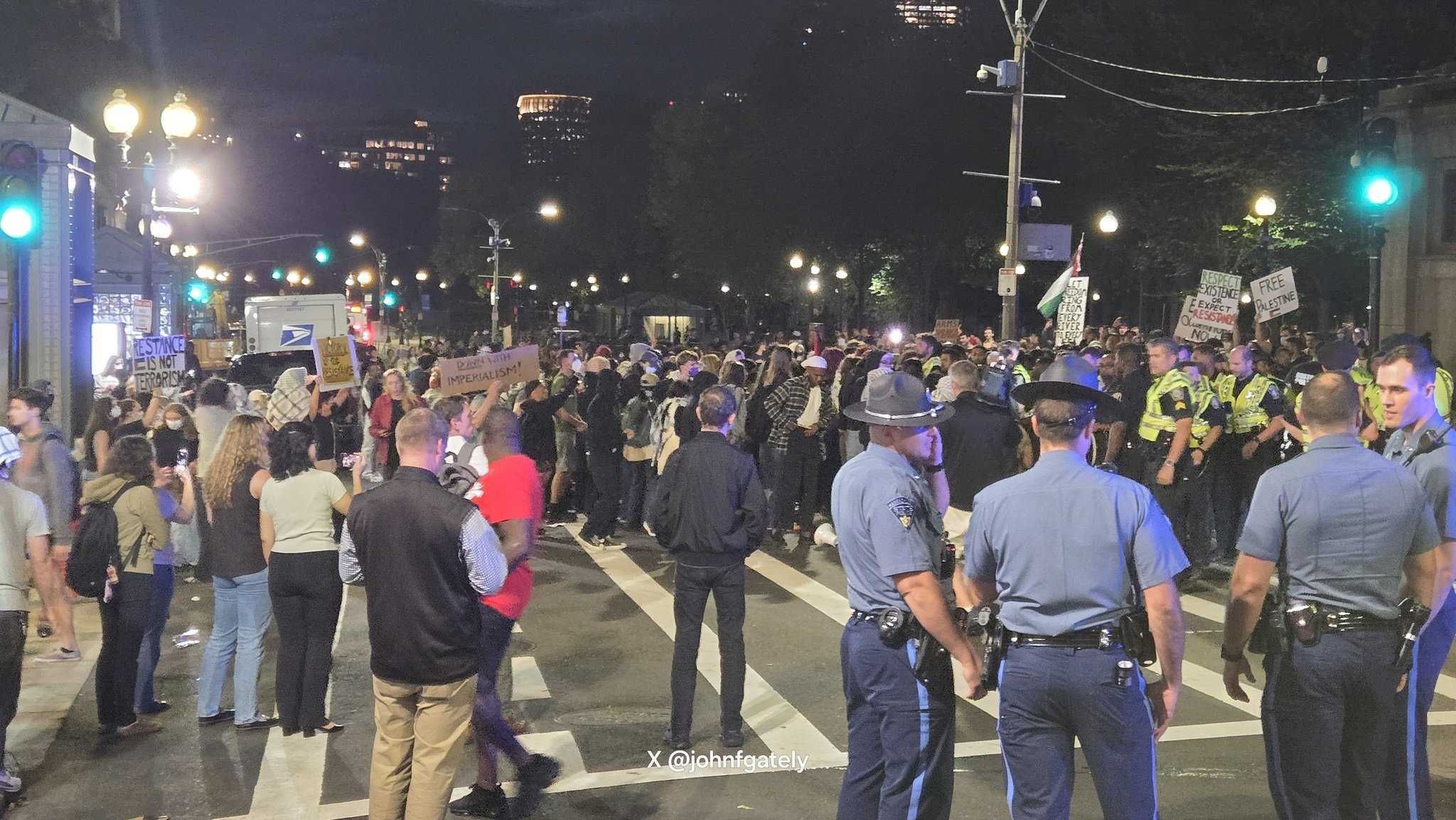 Tensions in the community were already high before Tuesday’s demonstration, Gately stated. He explained that a visiting professor from Harvard Law School fired off a pellet rifle near a Brookline synagogue last week on the eve of Yom Kippur. The professor allegedly told law enforcement he was “hunting rats.”