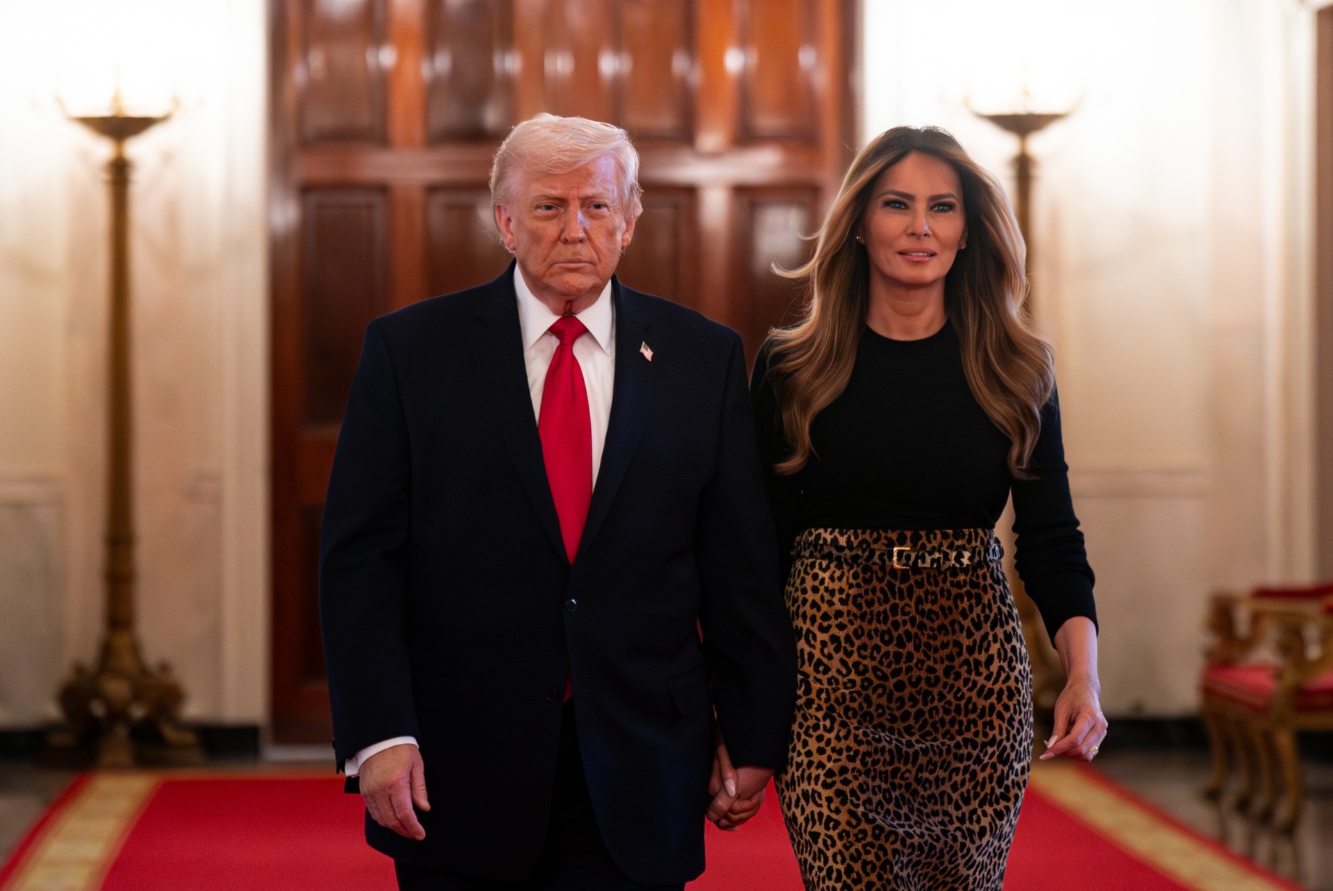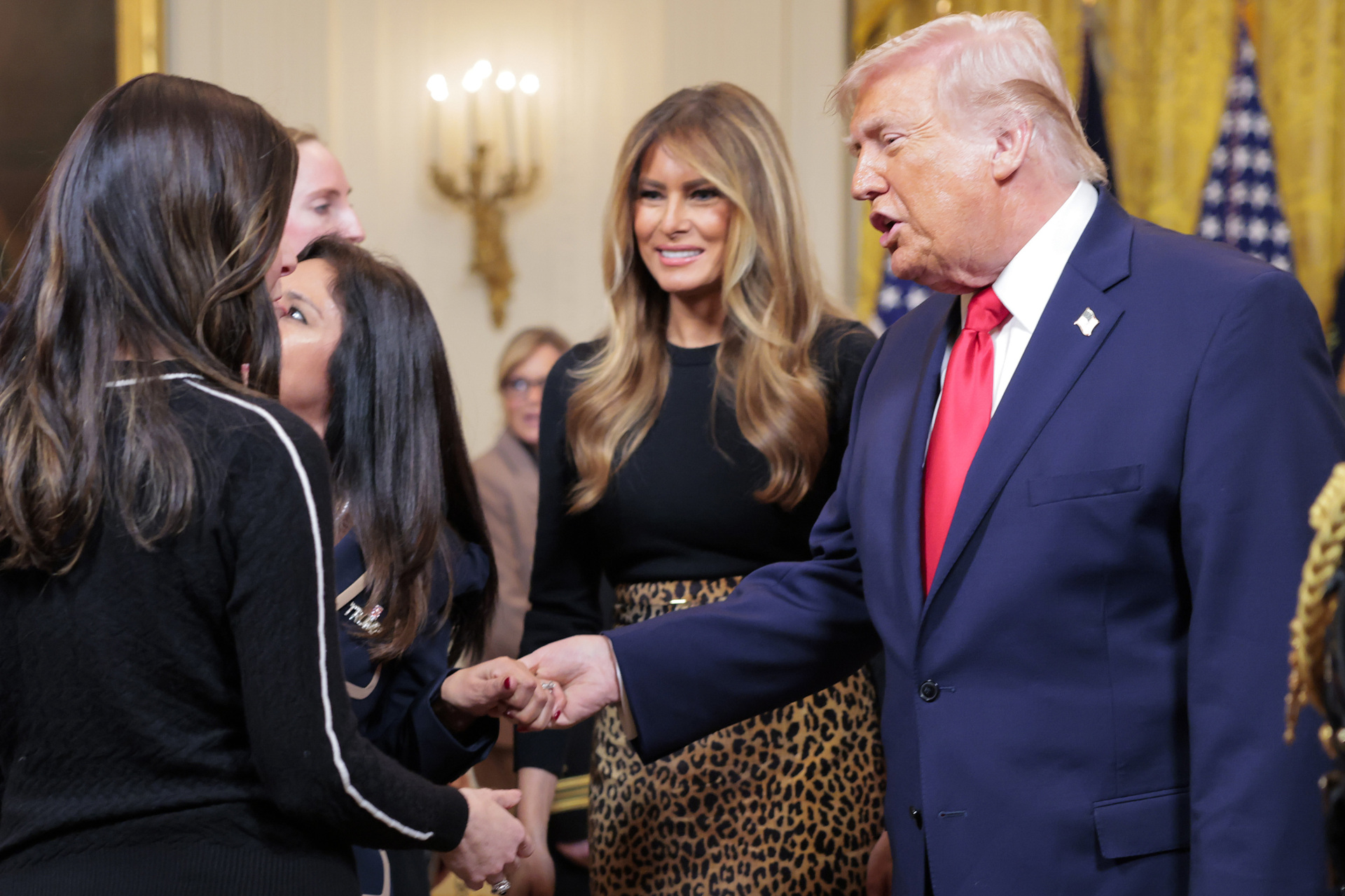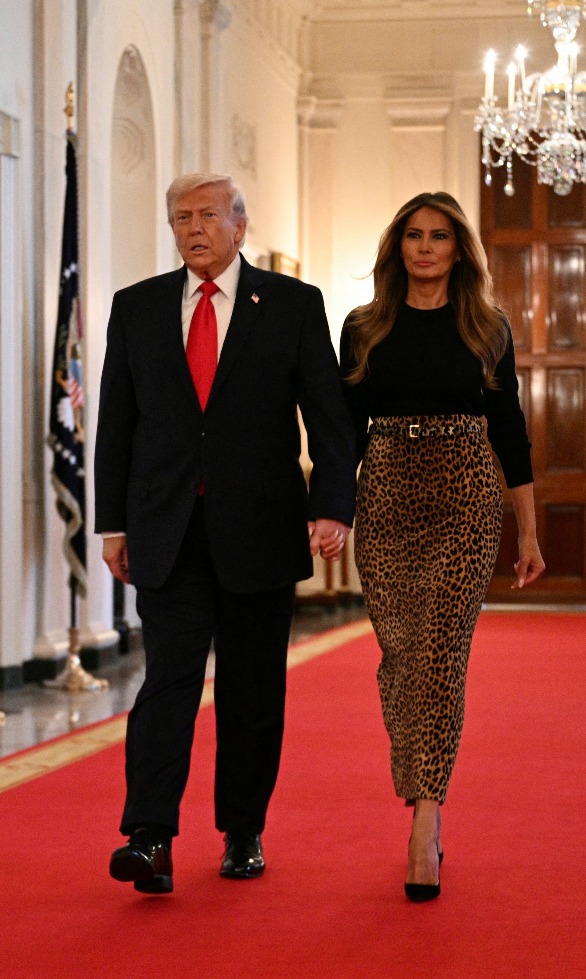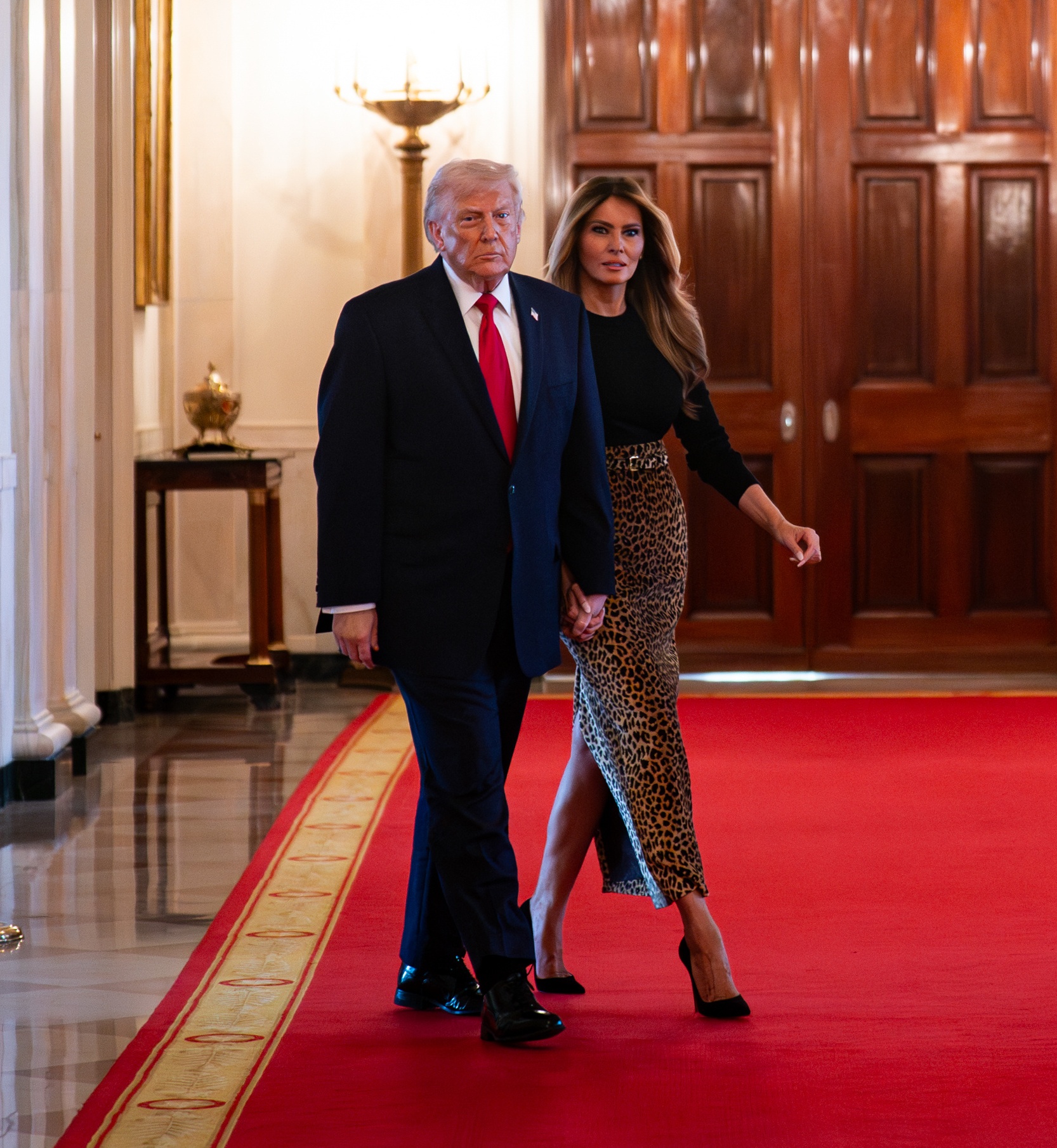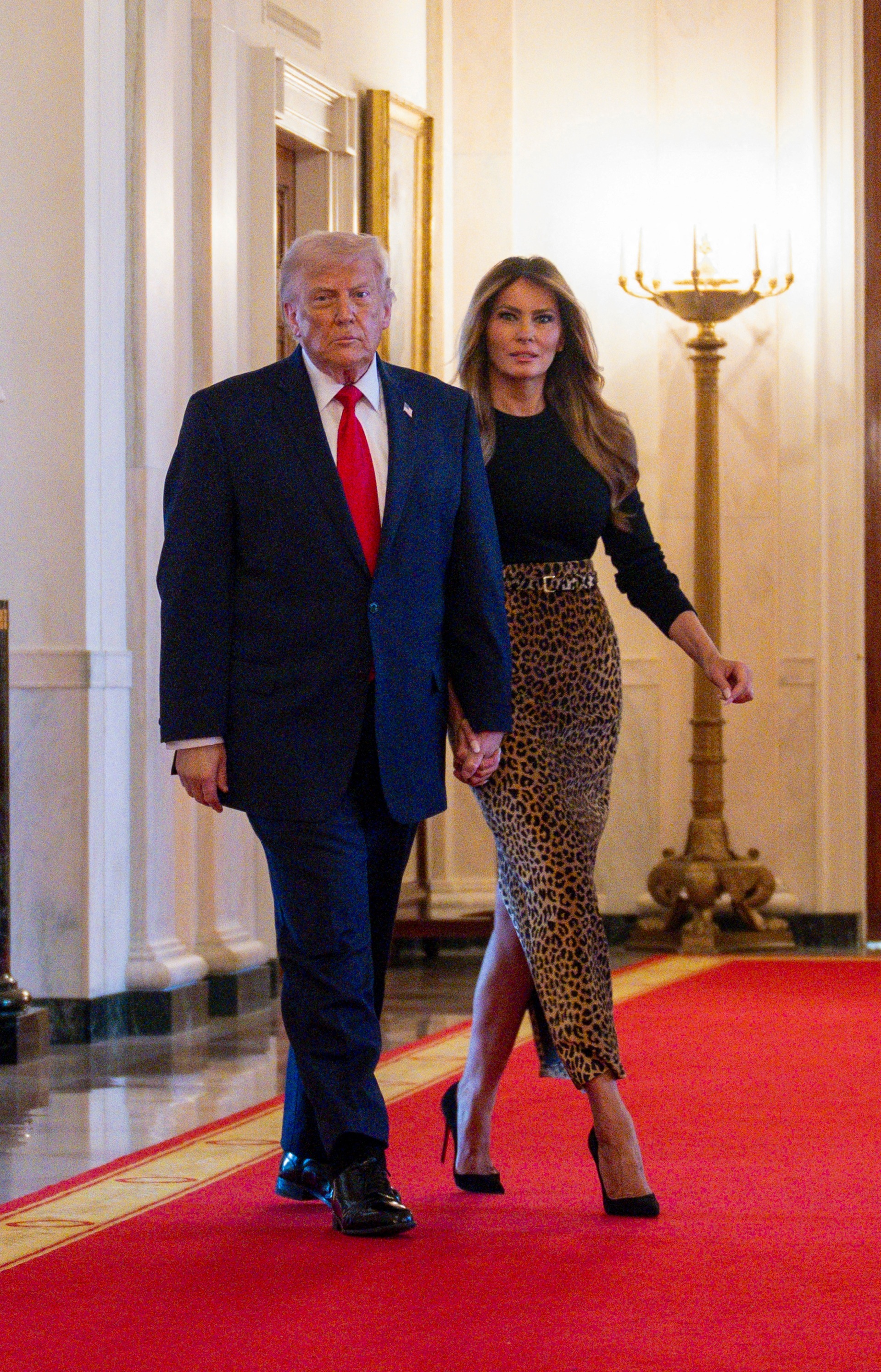 First Lady Melania Trump welcomed guests to the White House on Thursday evening to celebrate Women’s History Month, choosing a sulty leopard skirt from Adam Lippes — the man behind the first lady’s sharply tailored double-breasted wool coat that she donned on Inauguration Day last year.