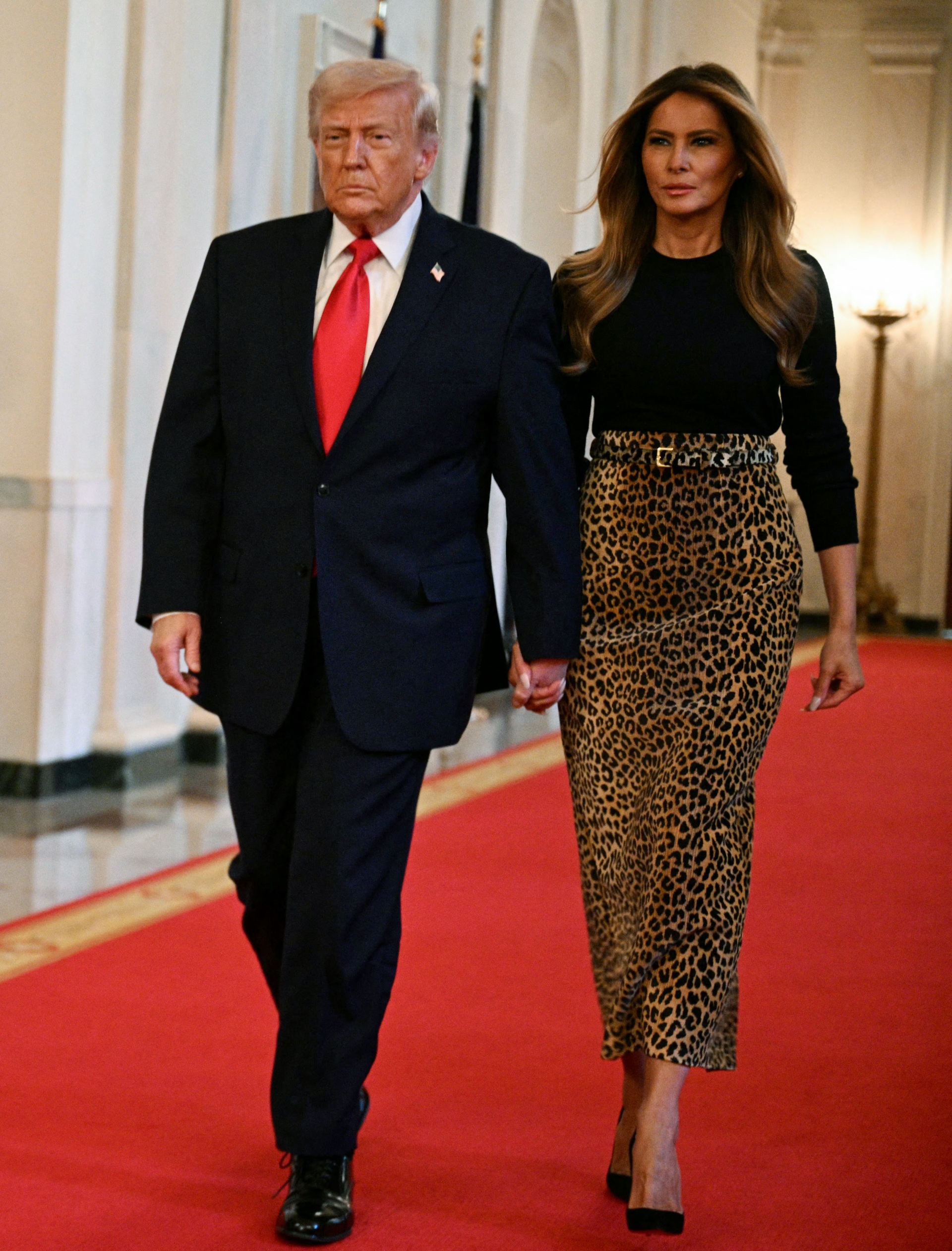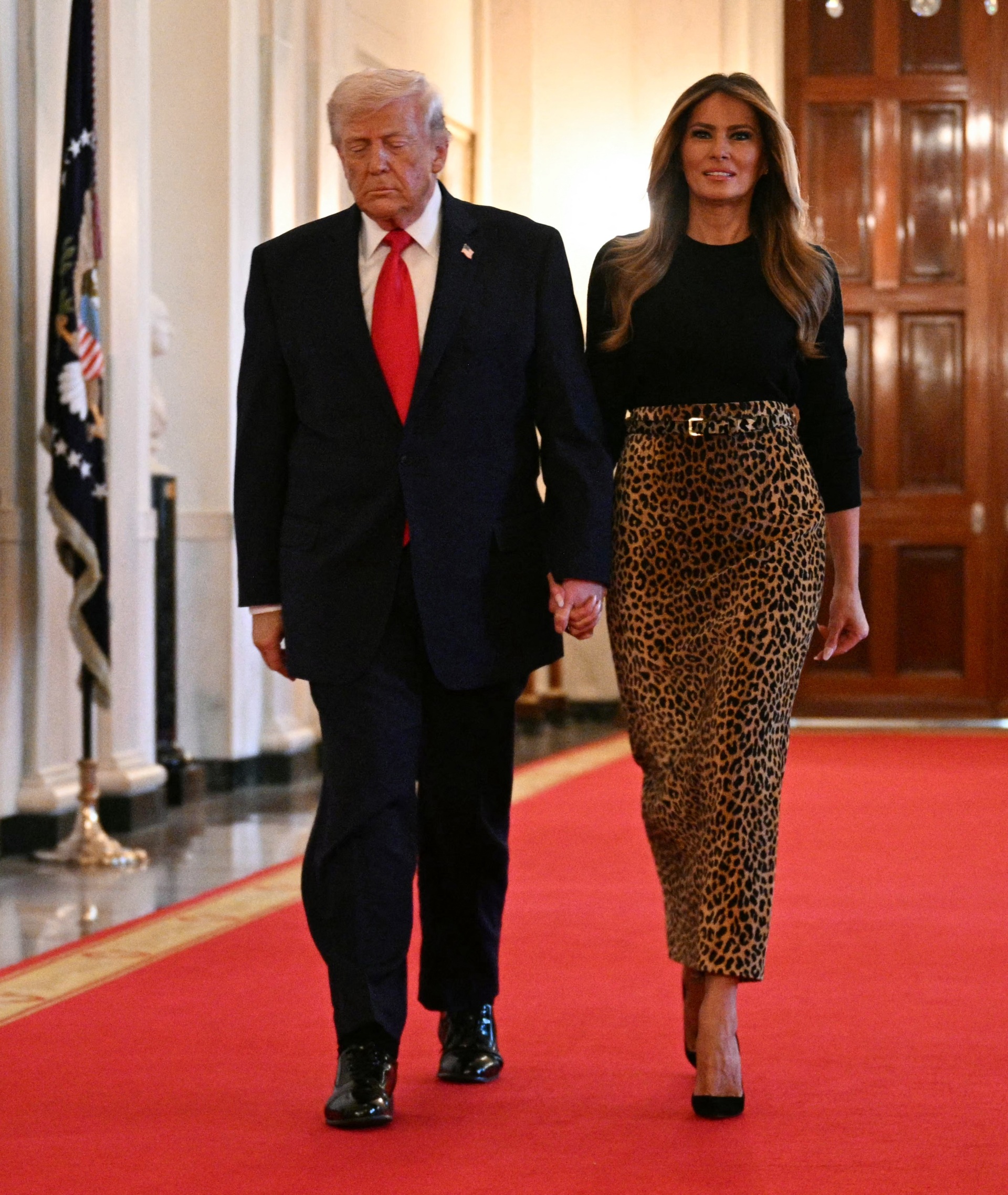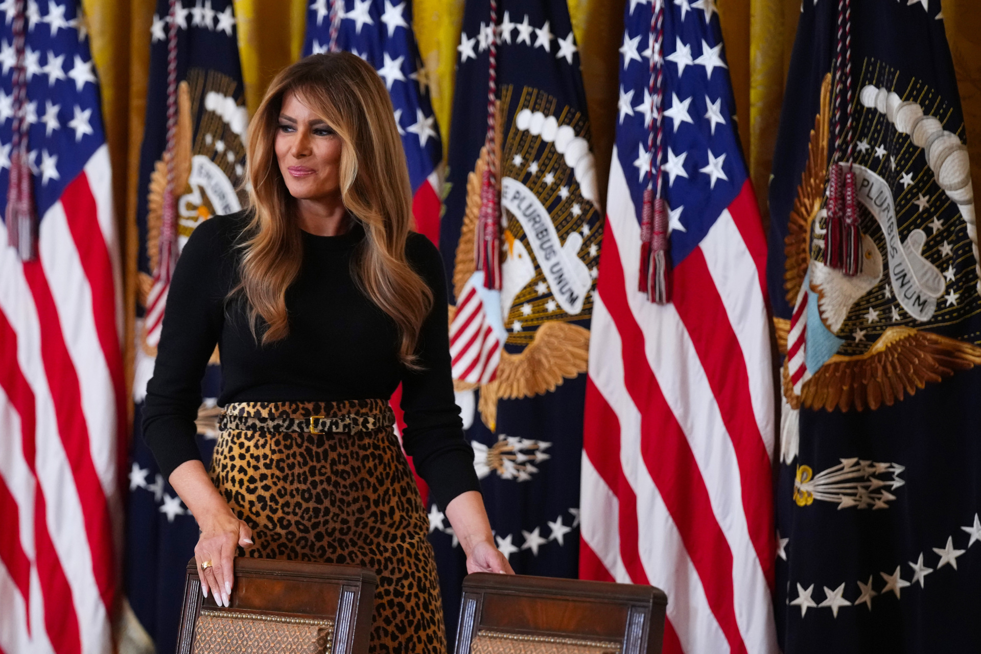 Melania Trump hosted the event, alongside her husband, in the East Room of the White House, wearing a Levi belted leopard-print chenille maxi skirt from Adam Lippes.