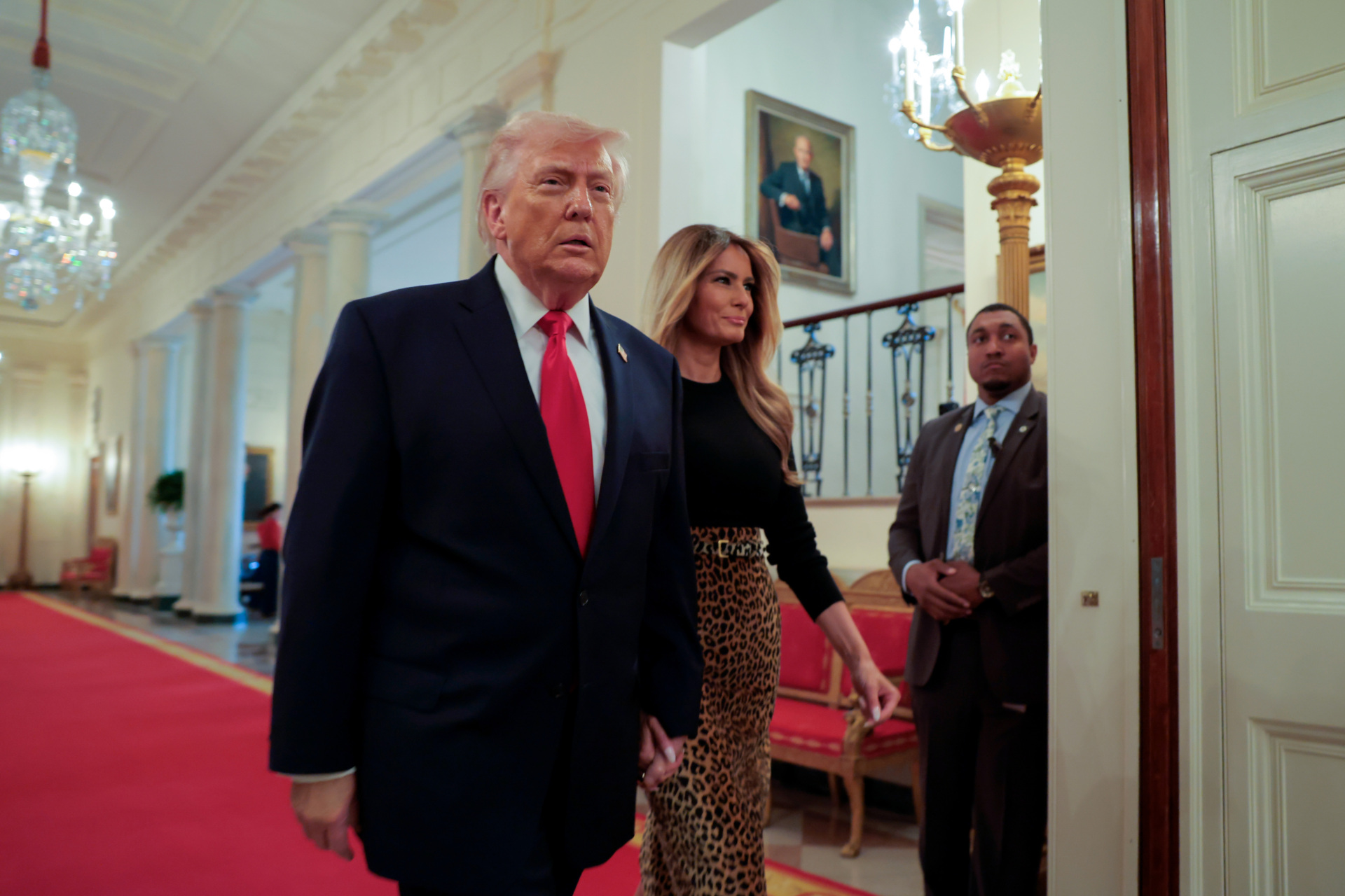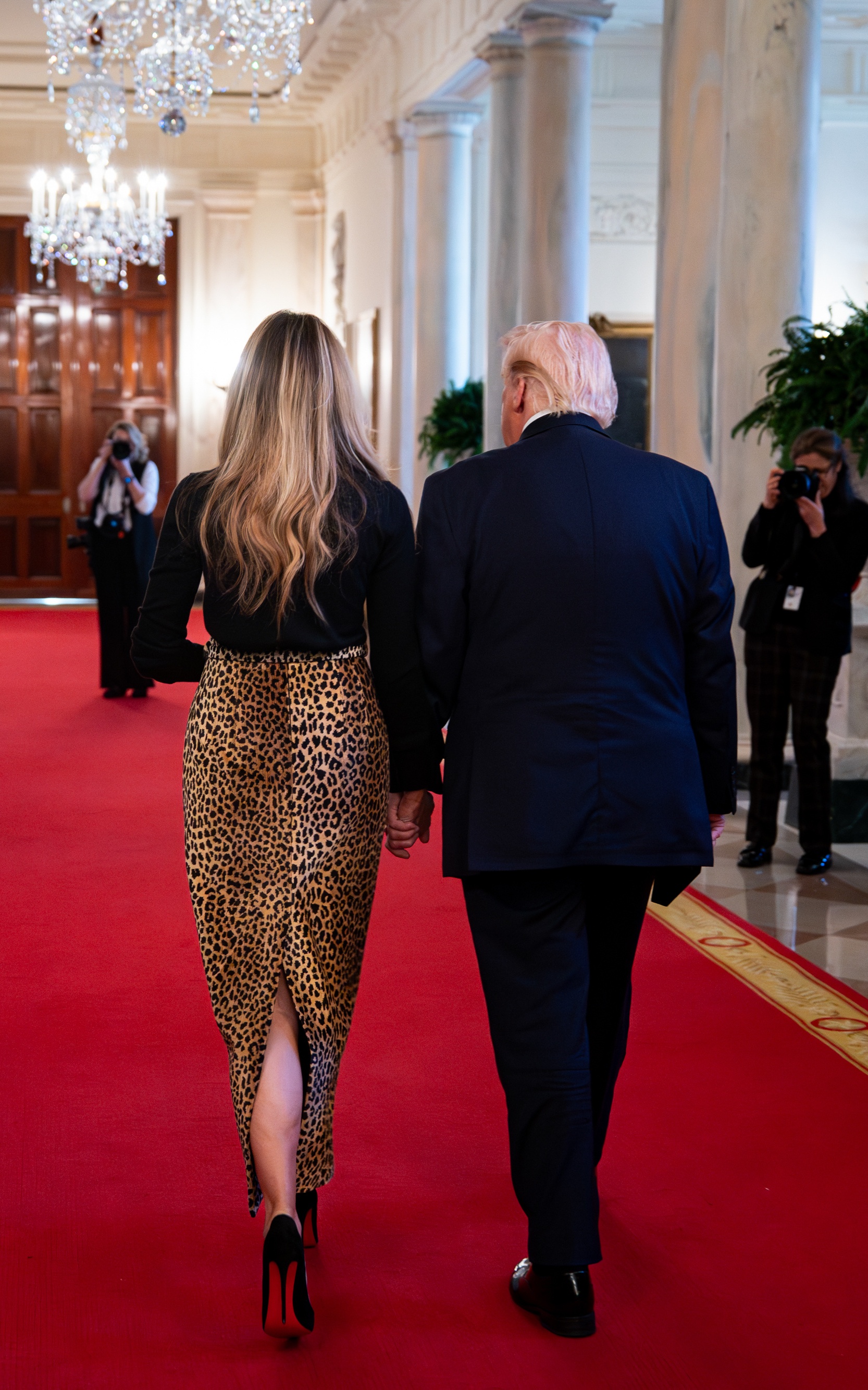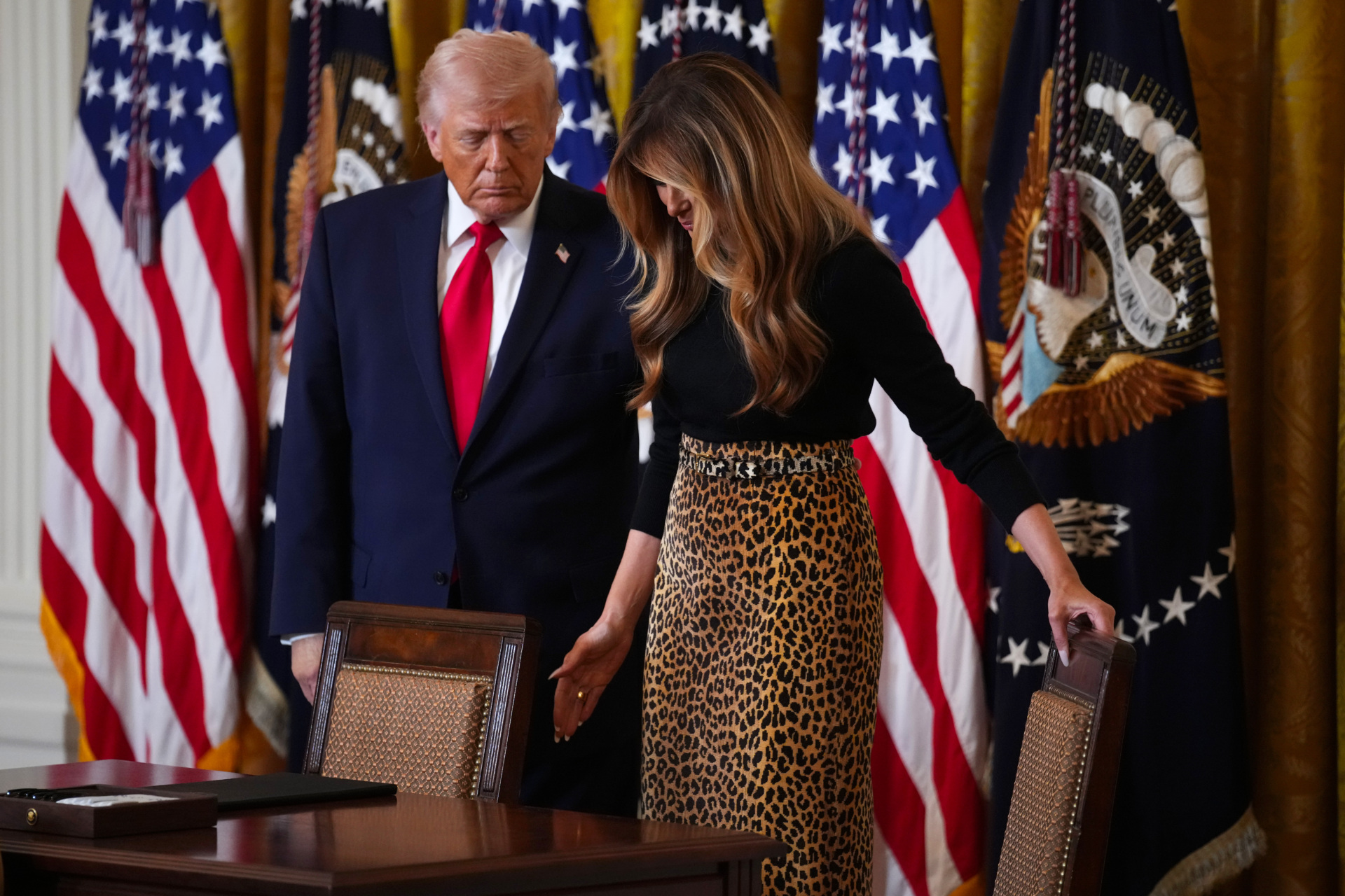 Melania Trump hosted the event, alongside her husband, in the East Room of the White House, wearing a Levi belted leopard-print chenille maxi skirt from Adam Lippes.