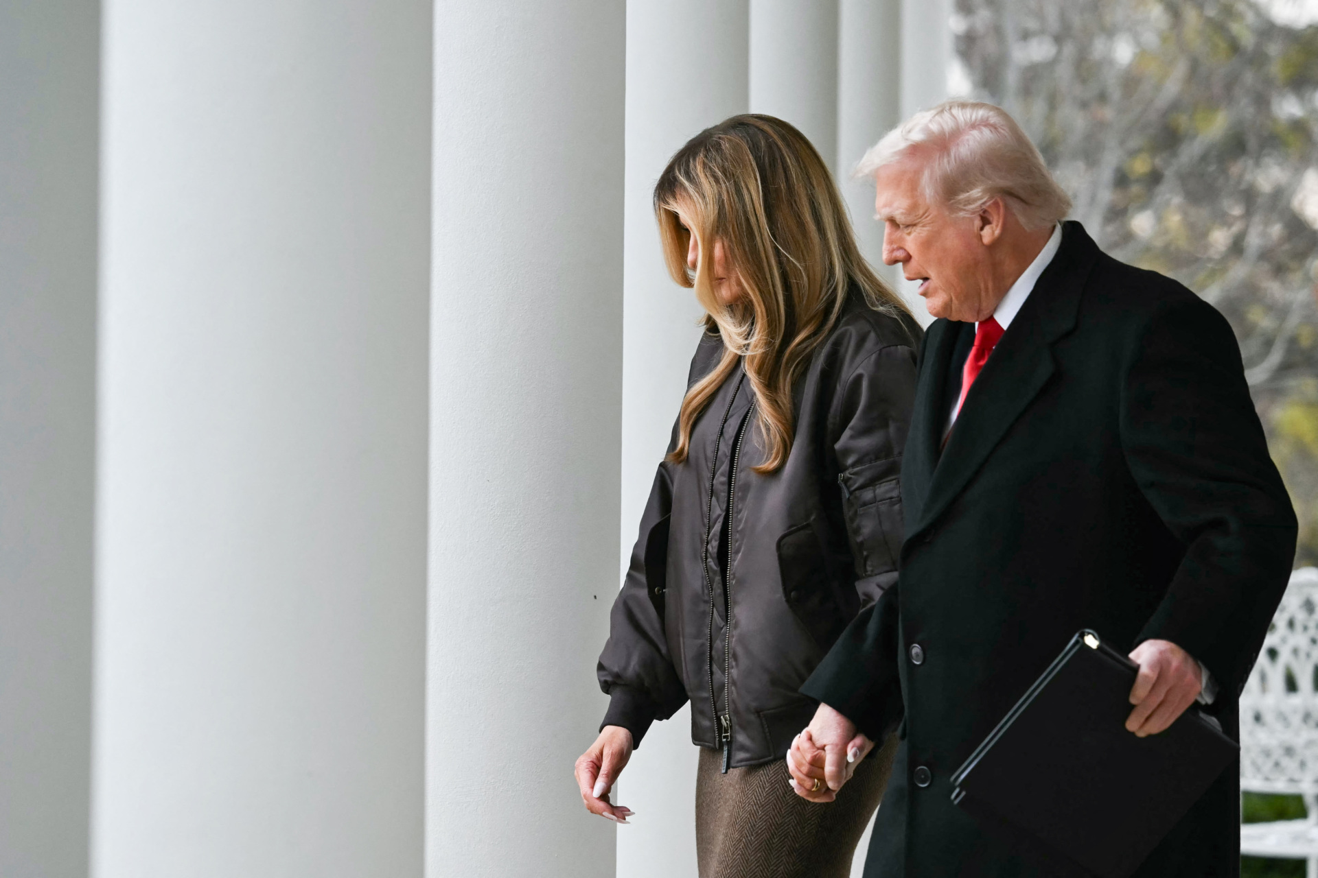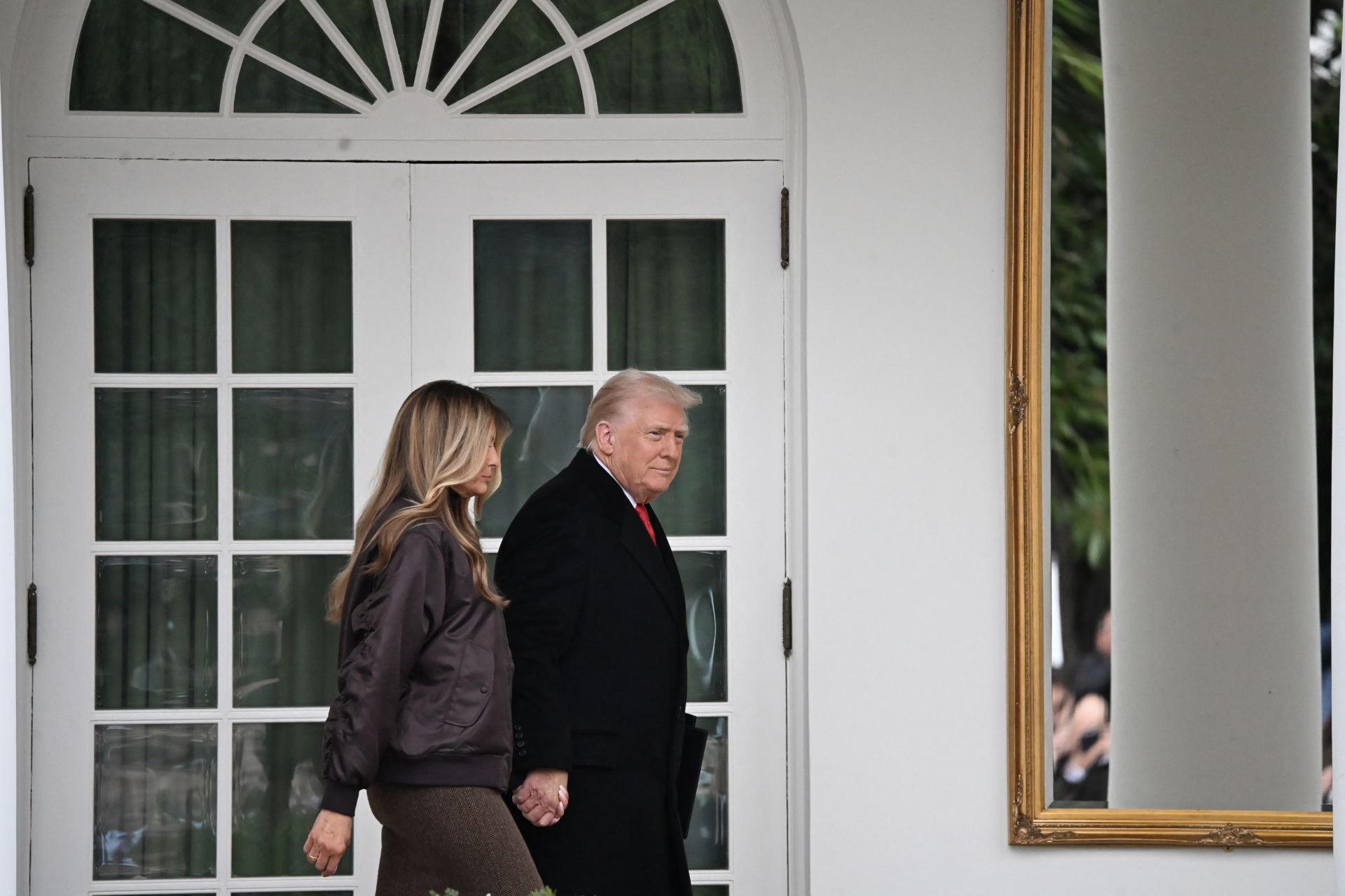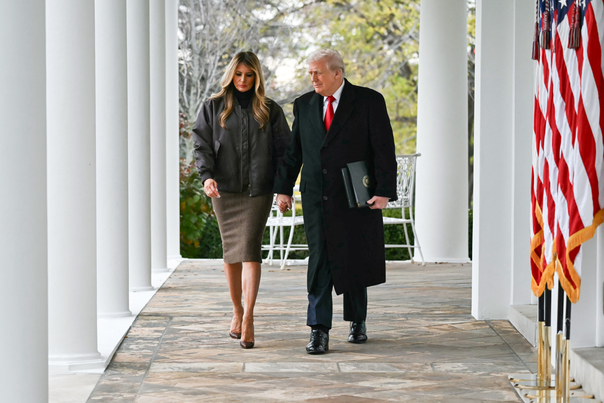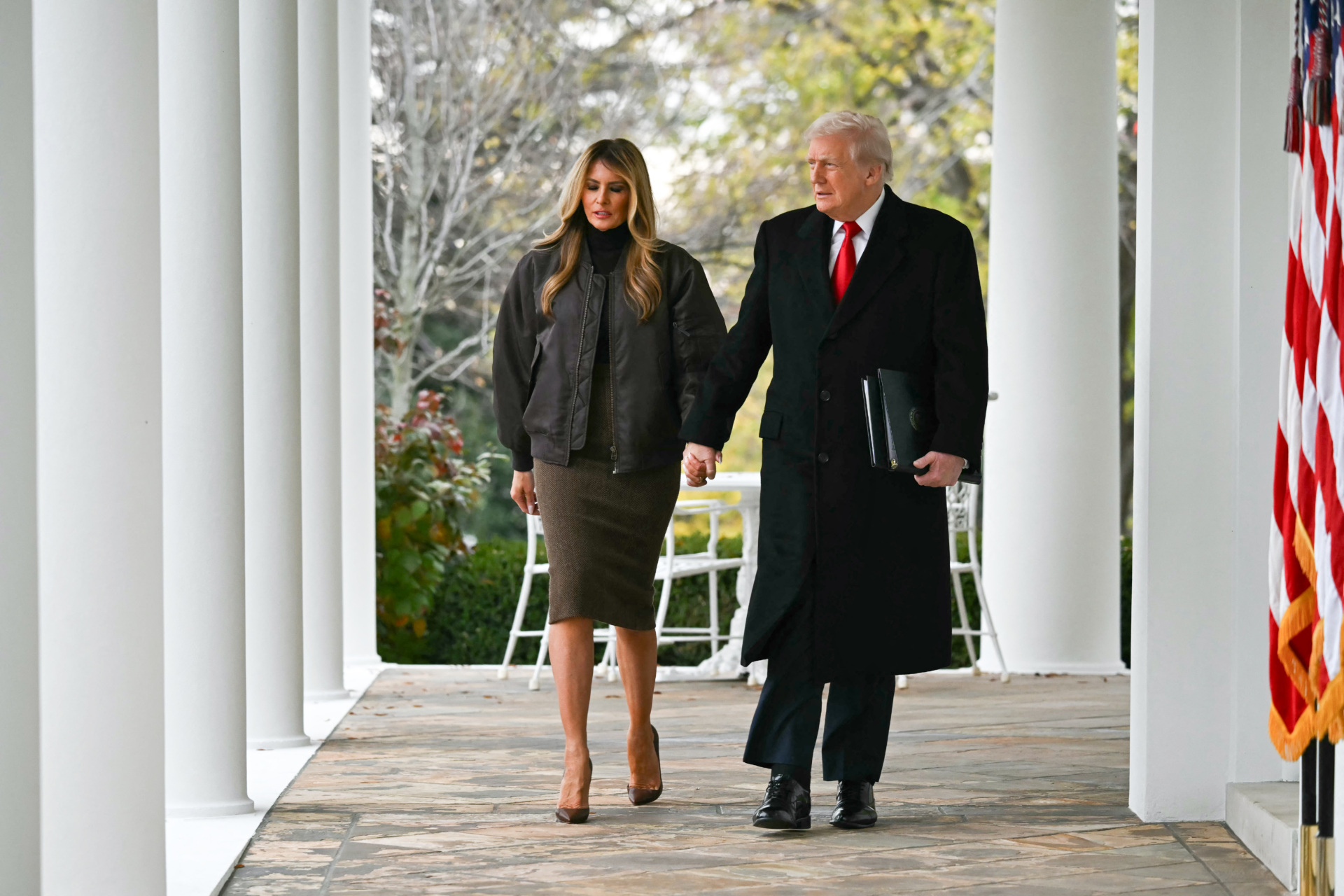 US President Donald Trump and First Lady Melania Trump walk back to the Oval Office after participating in the White House turkey pardon ceremony in the Rose Garden of the White House in Washington, DC on November 25, 2025. (Photo by ANDREW CABALLERO-REYNOLDS / AFP via Getty Images)